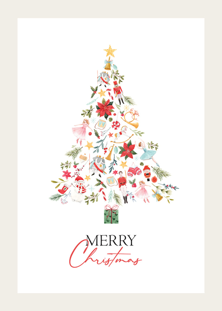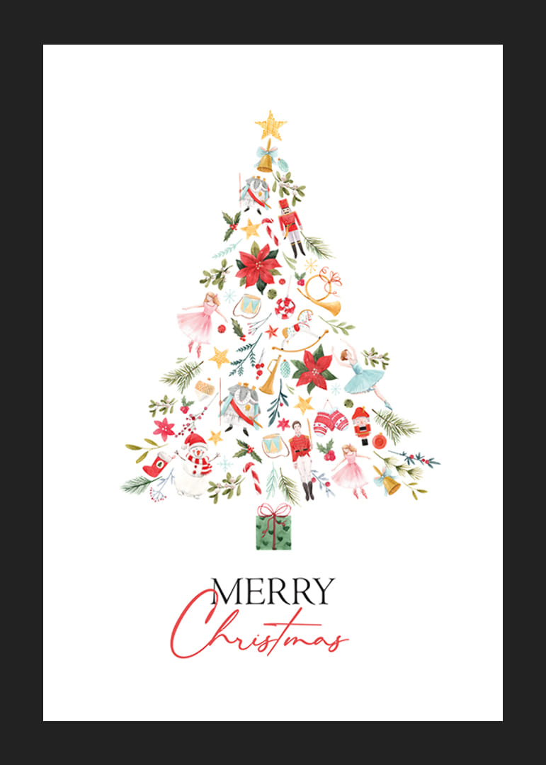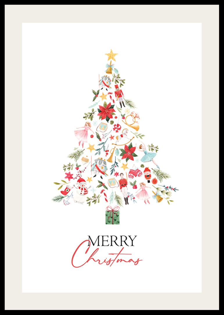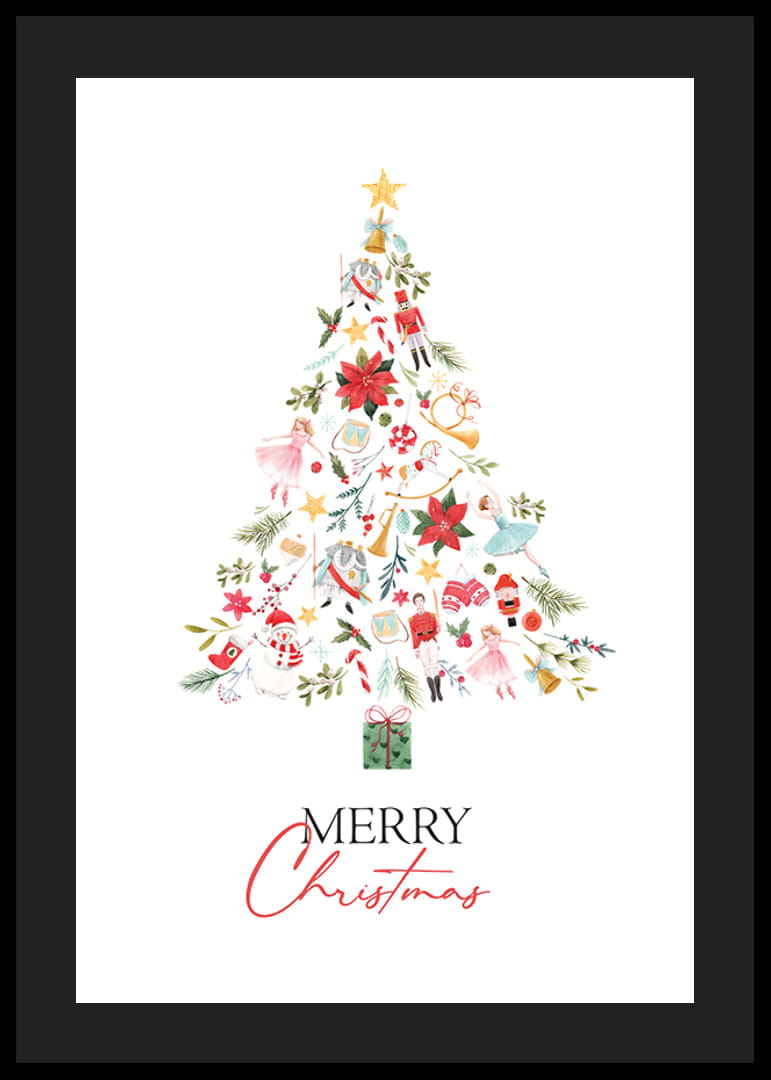El motivo consiste en un árbol de Navidad compuesto por adornos pintados, como cascanueces, bailarinas de ballet, paquetes, flores y símbolos navideños clásicos en rojo, verde y dorado. Debajo del árbol se encuentra el texto "Feliz Navidad" en negro y rojo. Este póster transmite una alegre atmósfera invernal y queda perfecto en la sala de estar o el pasillo.