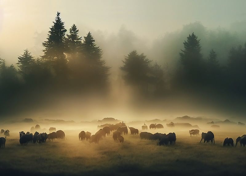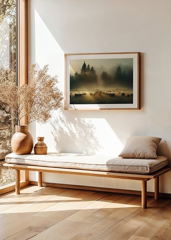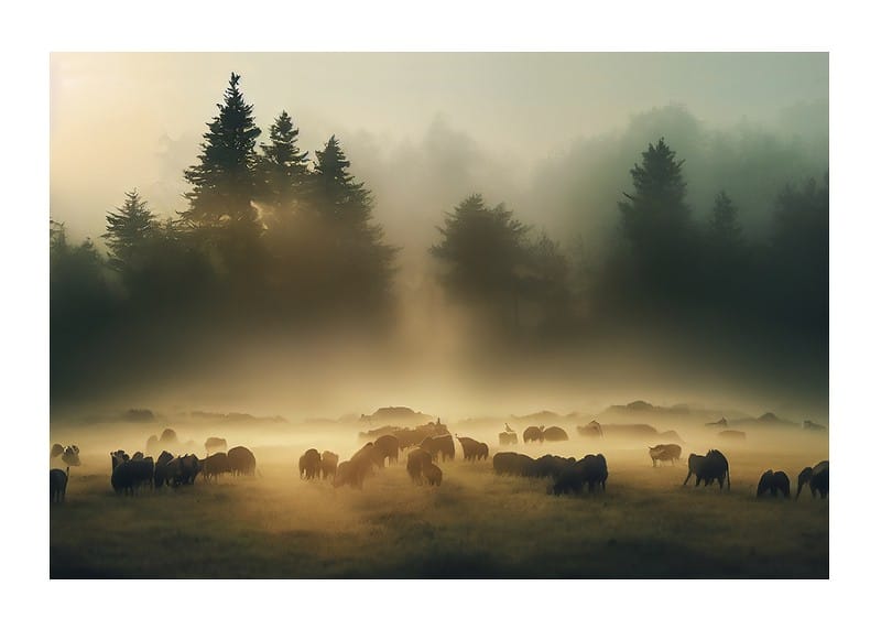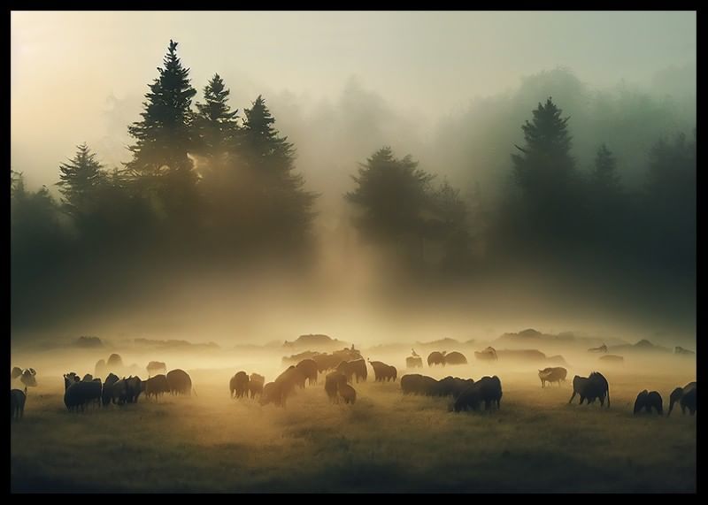 Un gran número de ovejas pastan en un prado abierto bajo la niebla matutina, mientras los suaves rayos de sol se filtran entre los árboles del fondo. Tonos verdes y amarillos apagados se combinan con la luz difusa, creando un apacible paisaje. Este póster transmite una sensación natural y es ideal para habitaciones donde se desea resaltar la tranquilidad de la naturaleza.