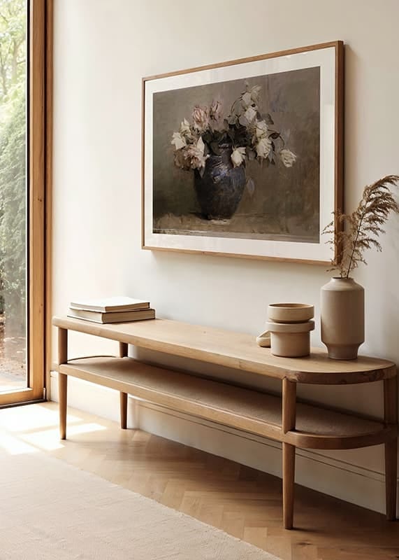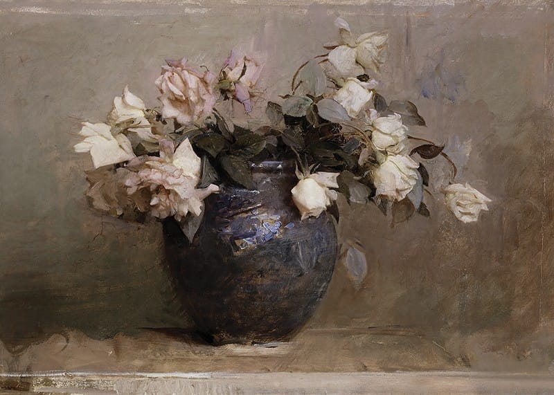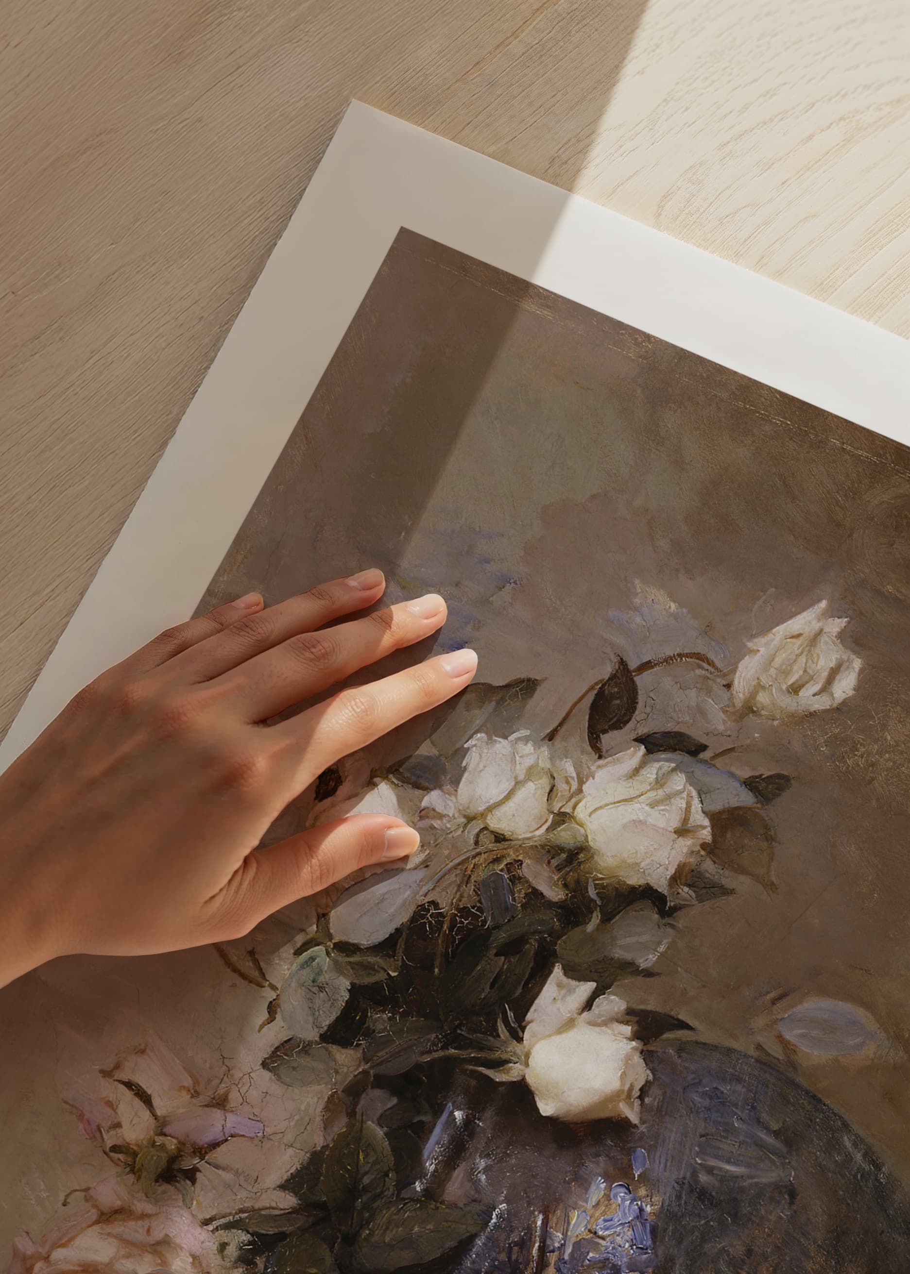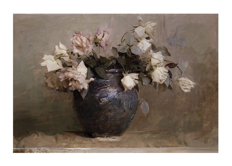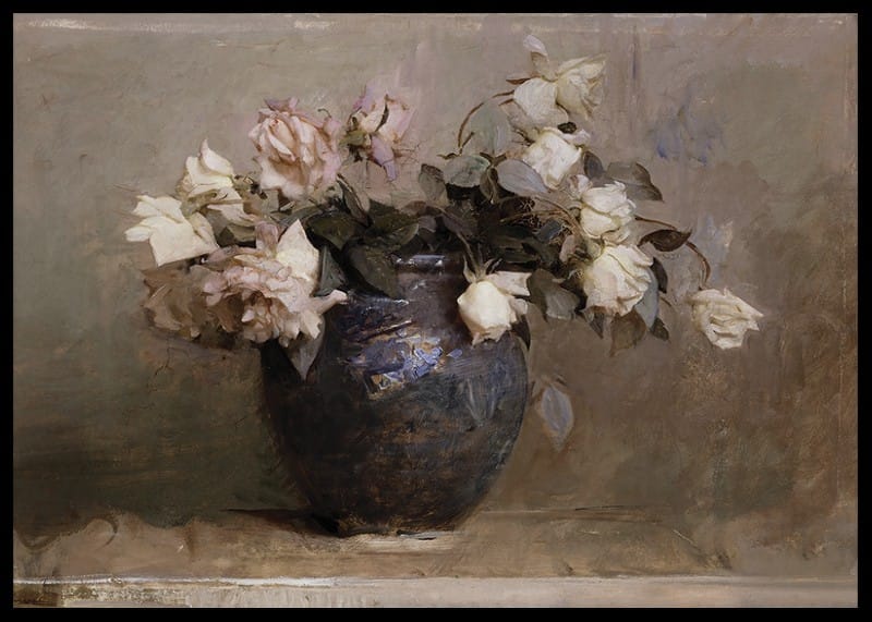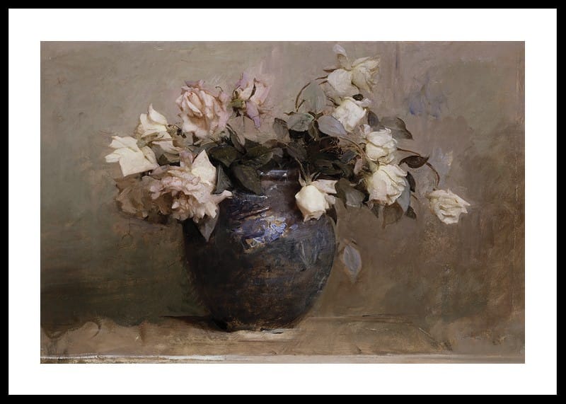 Póster con el cuadro "Roses" del artista estadounidense Abbott Handerson Thayer del año 1890. Thayer fue un destacado pintor impresionista que a menudo prefería pintar la naturaleza y los animales. Sus obras suelen estar llenas de detalles y hermosos colores. También fue un defensor de las técnicas de camuflaje utilizadas en la defensa del Ejército de los EE. UU. Thayer usó esta técnica para realzar pinturas de naturaleza y animales.