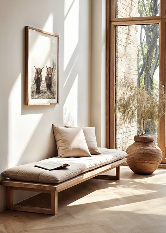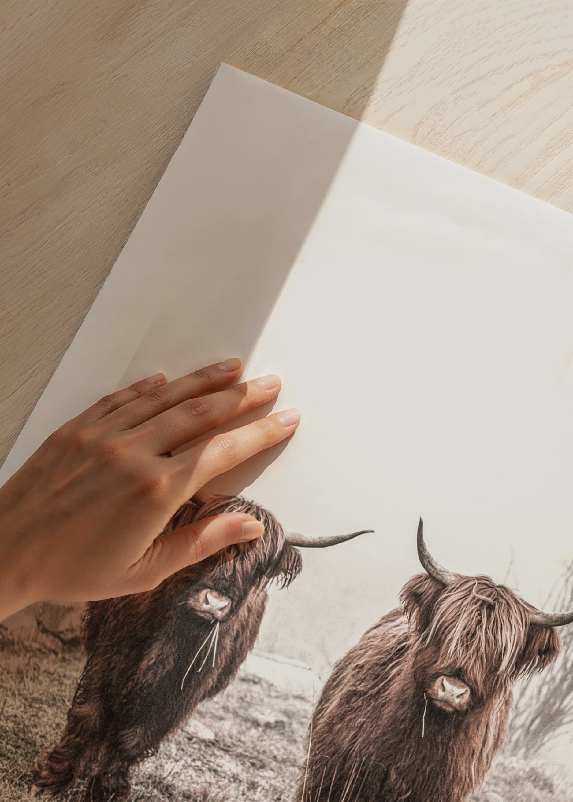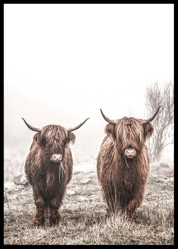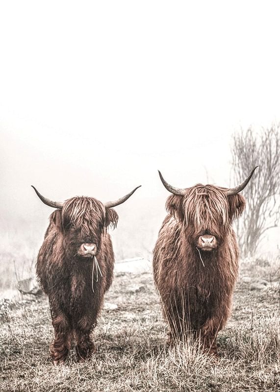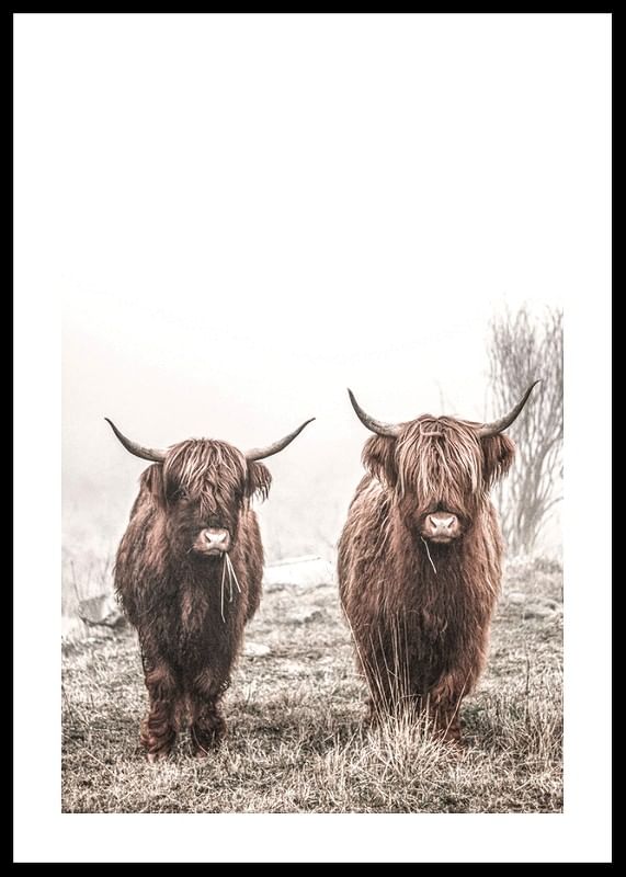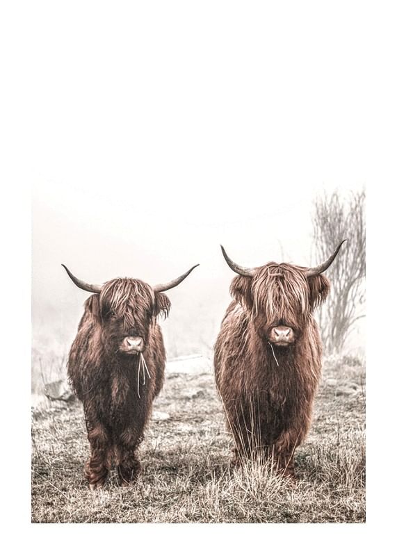 Dos vacas de pelo largo de las Tierras Altas de Escocia se encuentran juntas en un campo de hierba, rodeadas de una suave niebla y delicados tonos naturales. Sus características frentes largas y sus poderosos cuernos llaman la atención y confieren al motivo una auténtica atmósfera de las Tierras Altas de Escocia. El póster aporta un ambiente natural y rústico al hogar.