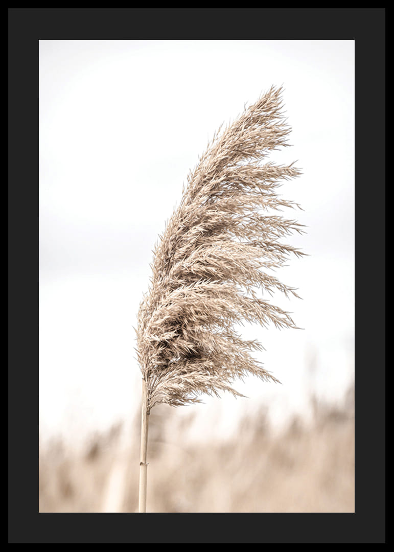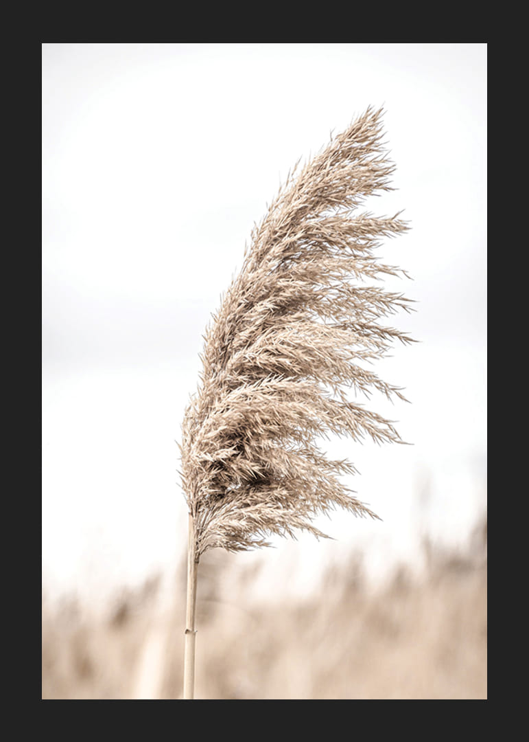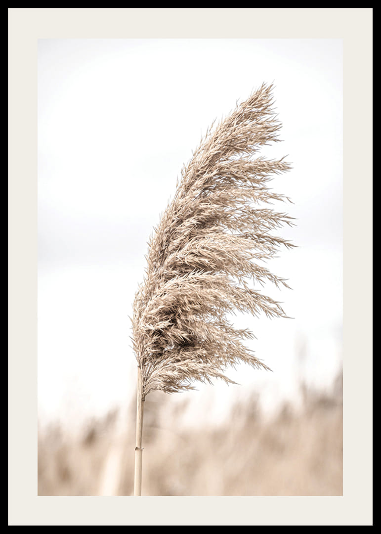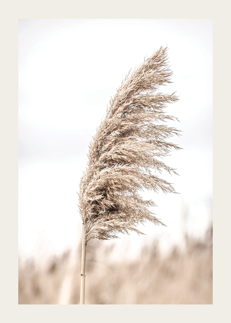 Las cañas individuales en tonos beige se destacan sobre un fondo claro y ligeramente difuminado, lo que le da al motivo una expresión natural y sobria. El contraste entre los detalles de las cañas y la suave luz crea una atmósfera serena. Este póster es ideal para habitaciones donde se desea añadir un toque natural.