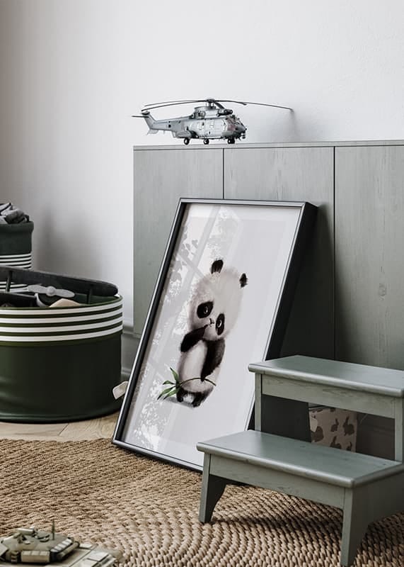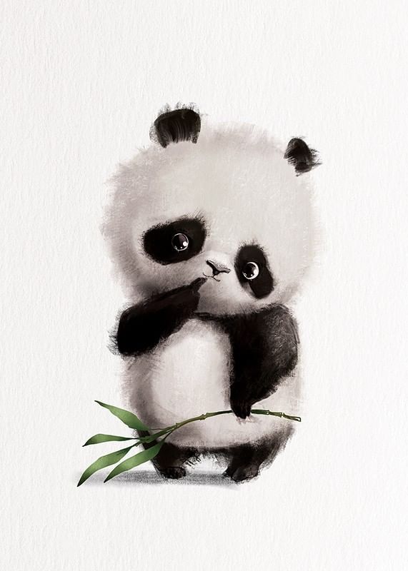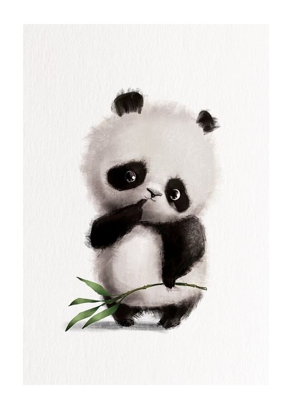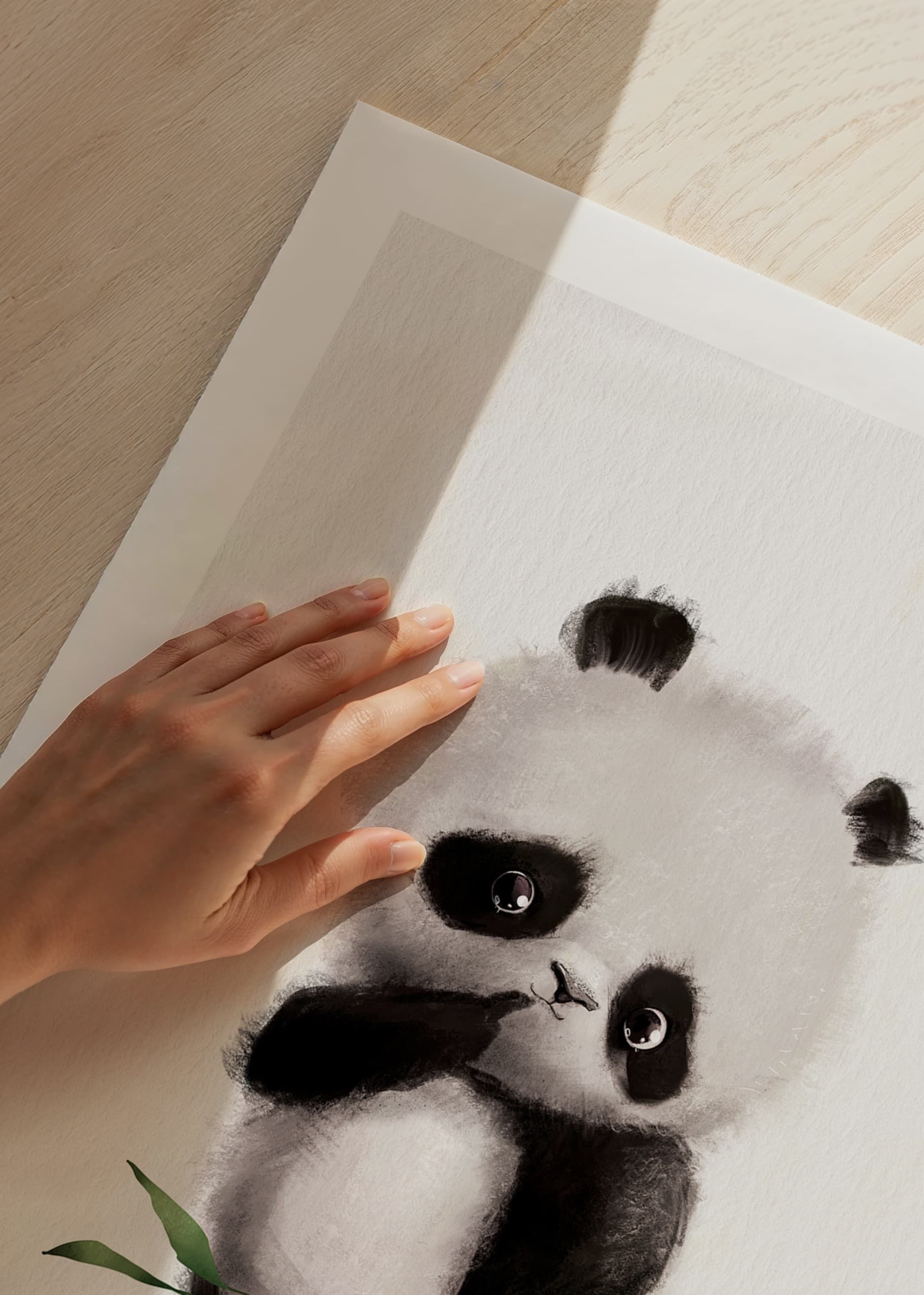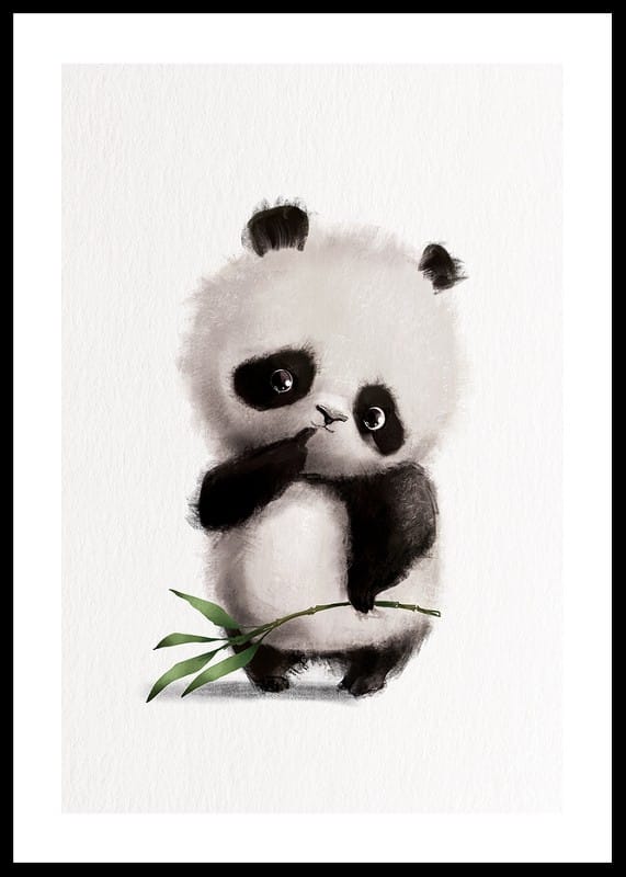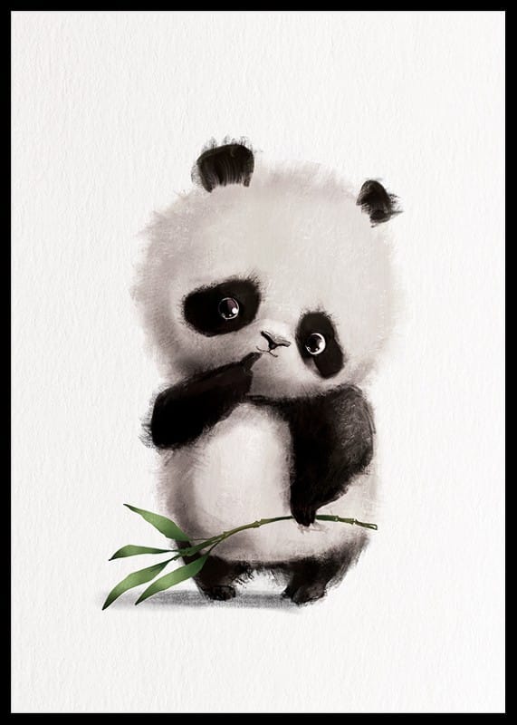 Un panda bebé peludo se yergue sobre un fondo blanco, sosteniendo una rama de bambú verde con una pata. La mirada se dirige hacia adelante y se lleva una pata a la boca en un gesto pensativo. La suave textura de acuarela y la sencilla composición convierten al póster en un elemento lúdico para la habitación infantil o el rincón de juegos.