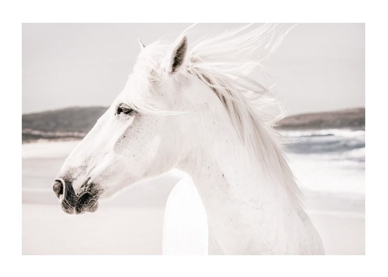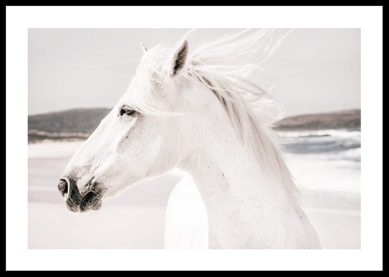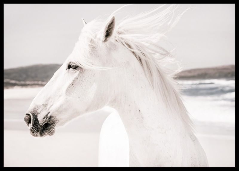 Caballo blanco de perfil con el viento en sus crines y las olas del mar de fondo. Colores claros y tenues y contrastes suaves le dan un toque elegante. Este póster encaja tanto en salones como en dormitorios, donde los motivos naturales realzan la impresión y crean un espacio luminoso y abierto.