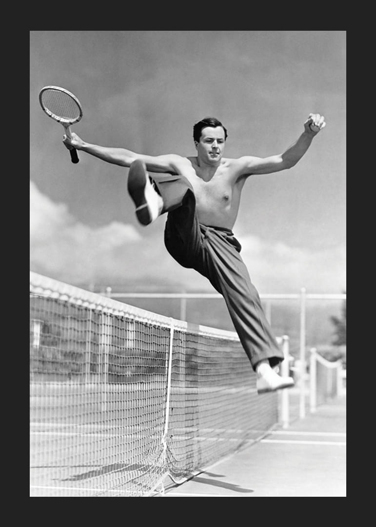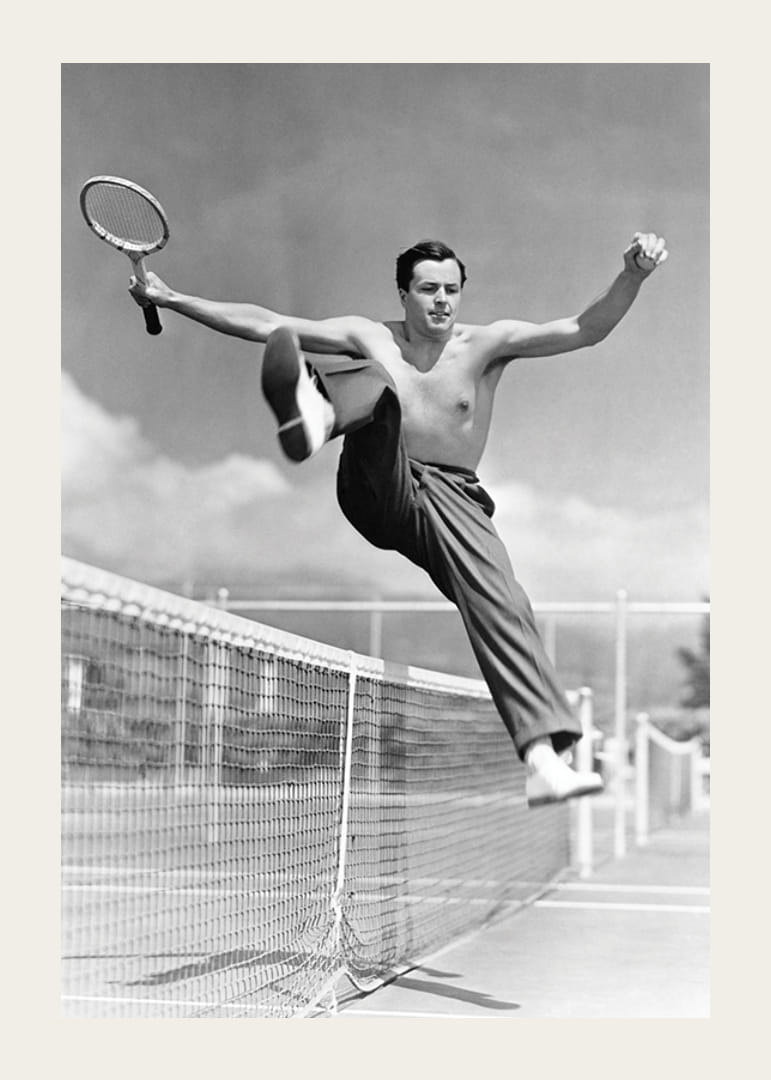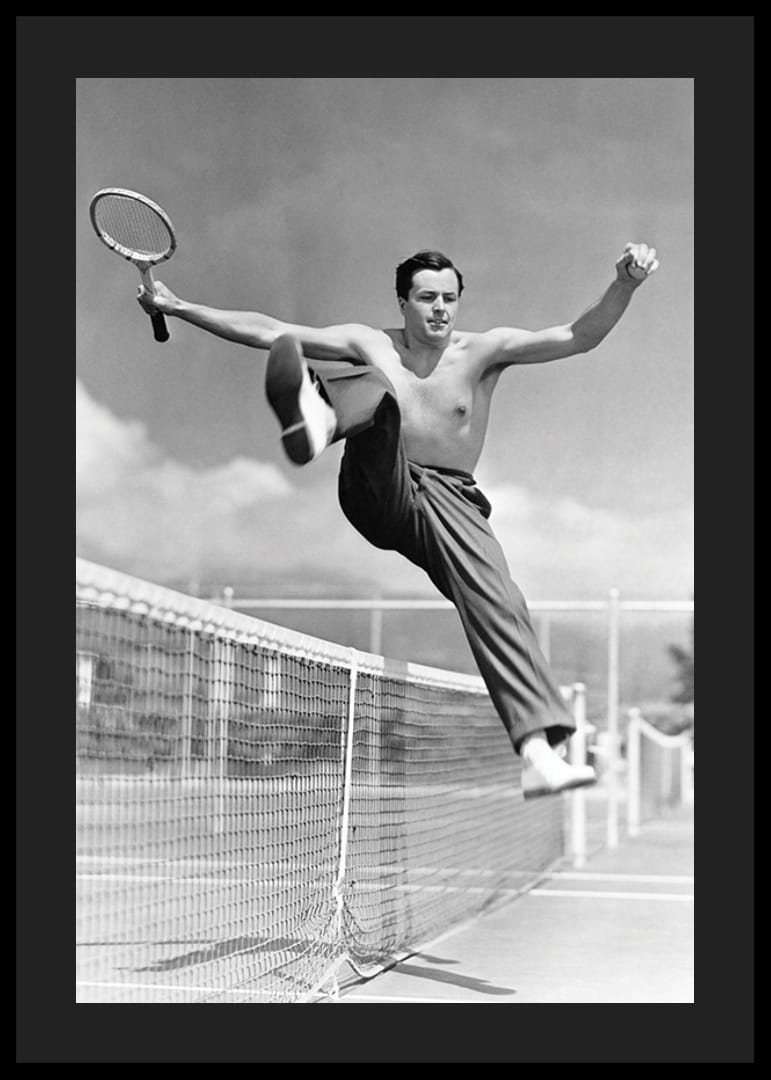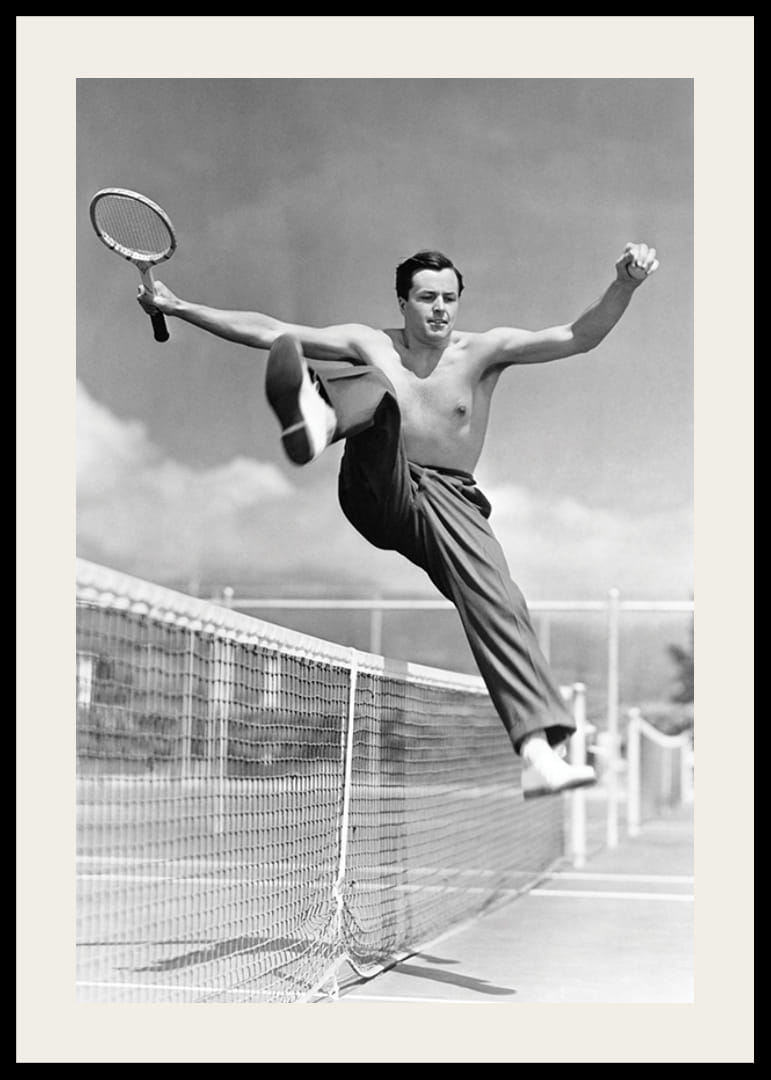 Un hombre con el torso desnudo y pantalones largos es retratado saltando con fuerza sobre una red de hojalata, con una raqueta en la mano y una postura expresiva. Los marcados contrastes y una cancha de tenis típica de la época crean un estilo retro clásico. El póster añade un toque deportivo y enérgico a, por ejemplo, una sala de estar o un estudio.