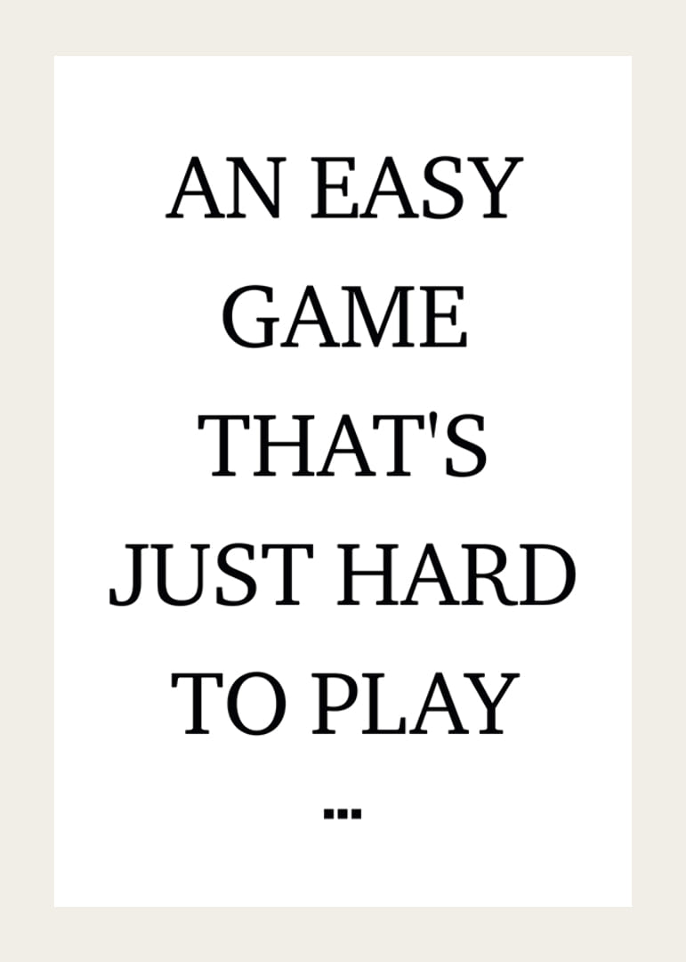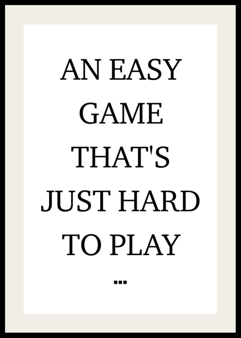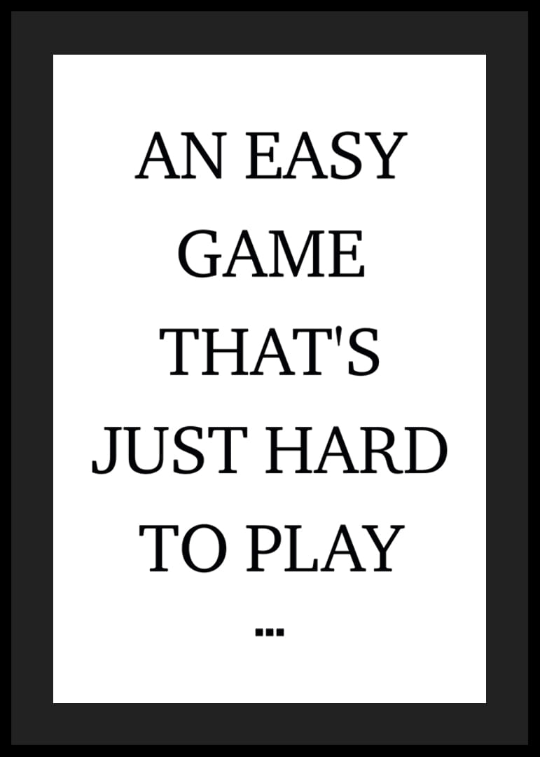 El motivo consiste en texto negro en mayúsculas claras sobre fondo blanco, centrado y sencillo, sin decoración. La cita en inglés dice: «Un juego fácil que es simplemente difícil de jugar...». Un póster minimalista que encaja en una oficina en casa, un gimnasio o un pasillo y añade un toque reflectante al interior.