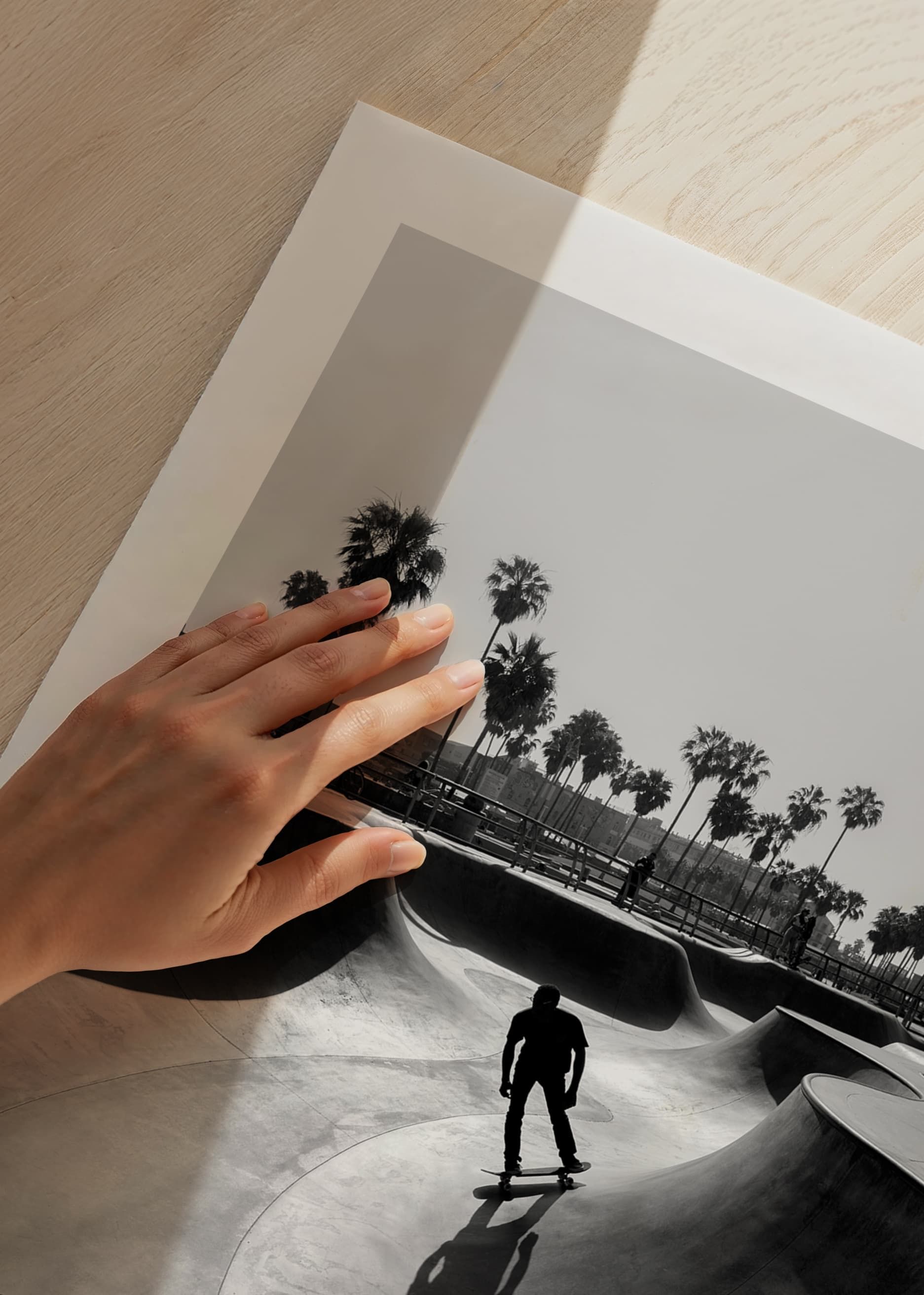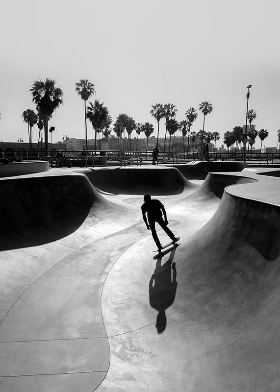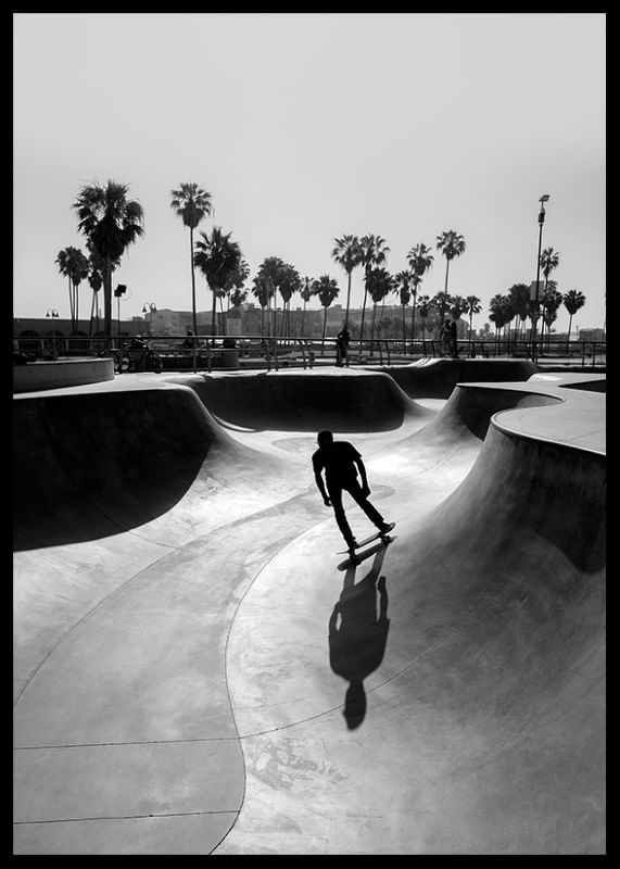 Se recorta la silueta de un skater mientras recorre suaves curvas en un clásico parque de hormigón, rodeado de altas palmeras bajo el cielo abierto. Los contrastes en blanco y negro realzan las elegantes formas y la relajada vida playera. El póster es ideal para habitaciones que buscan un ambiente moderno y urbano.
