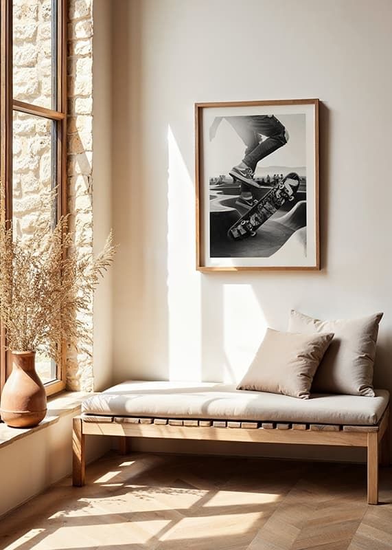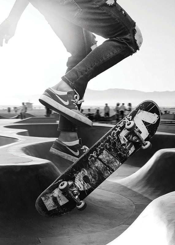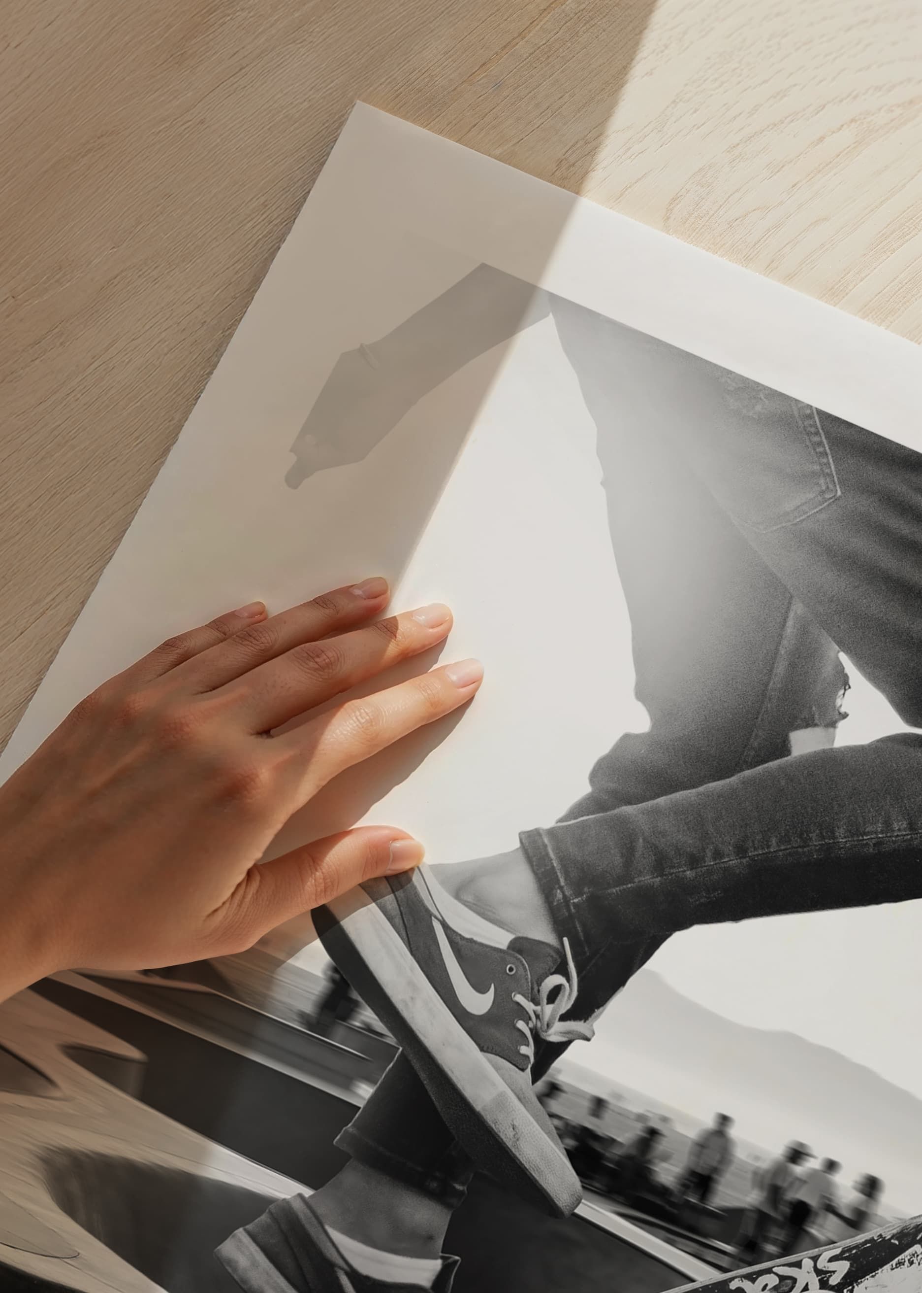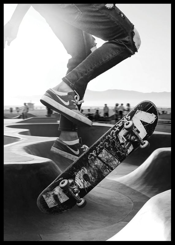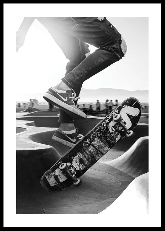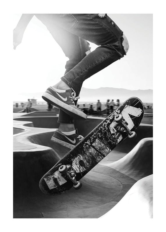Un momento captura a un skater deslizándose por una rampa de hormigón, con sus vaqueros rotos y sus zapatillas desgastadas claramente visibles. Los tonos blanco y negro del motivo resaltan los contrastes entre el skater, la tabla y la soleada pista de skate. El póster transmite un aire urbano y se adapta a todo tipo de espacios, desde dormitorios juveniles hasta salones modernos.