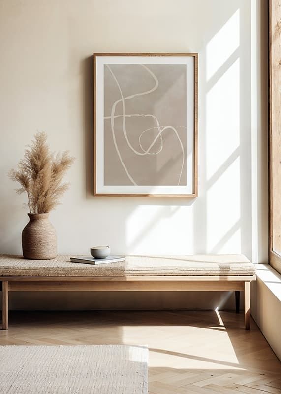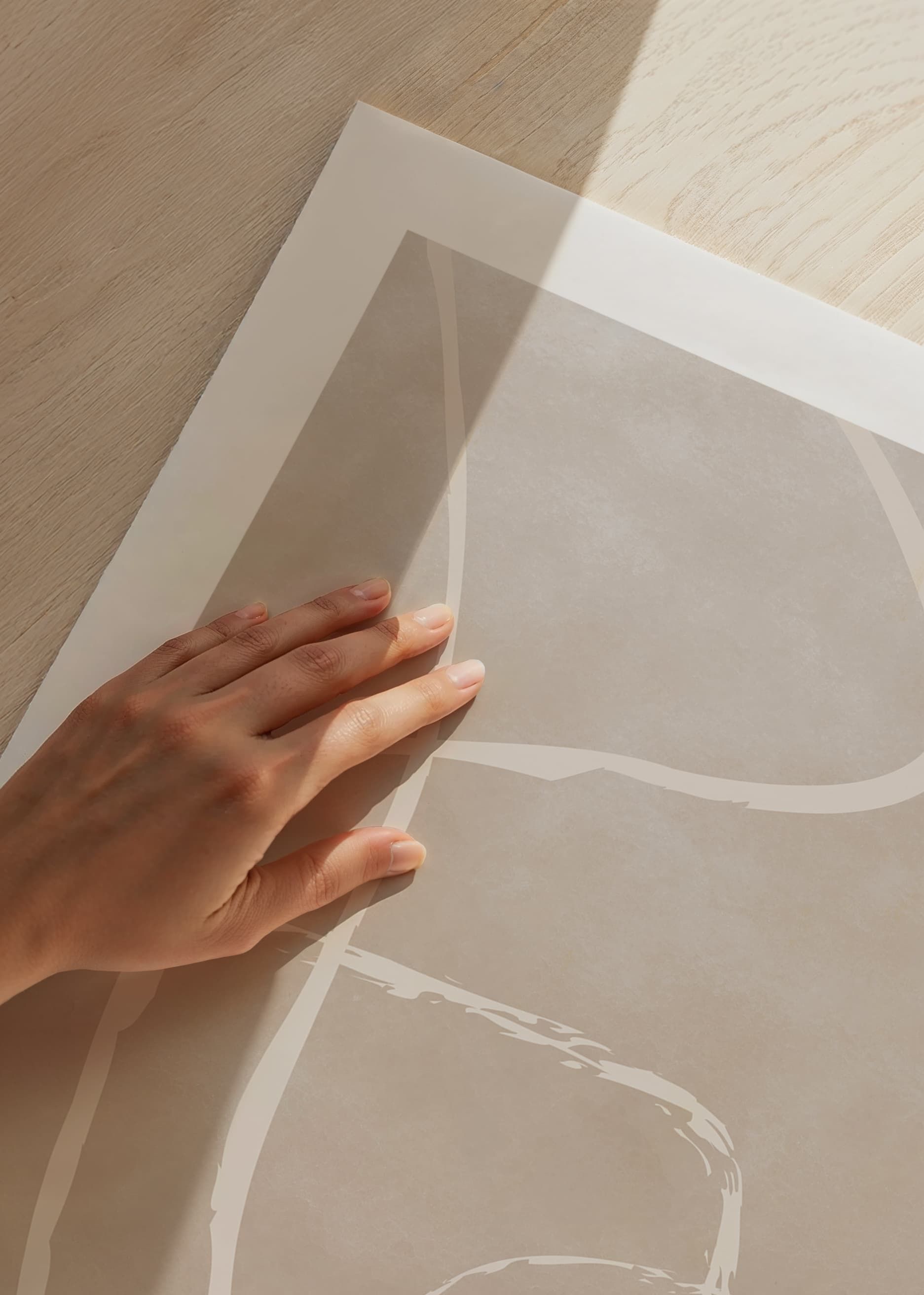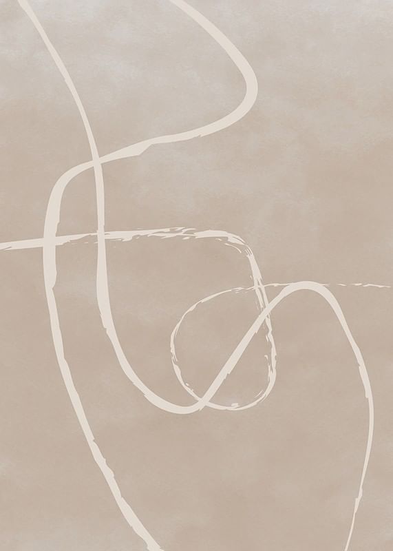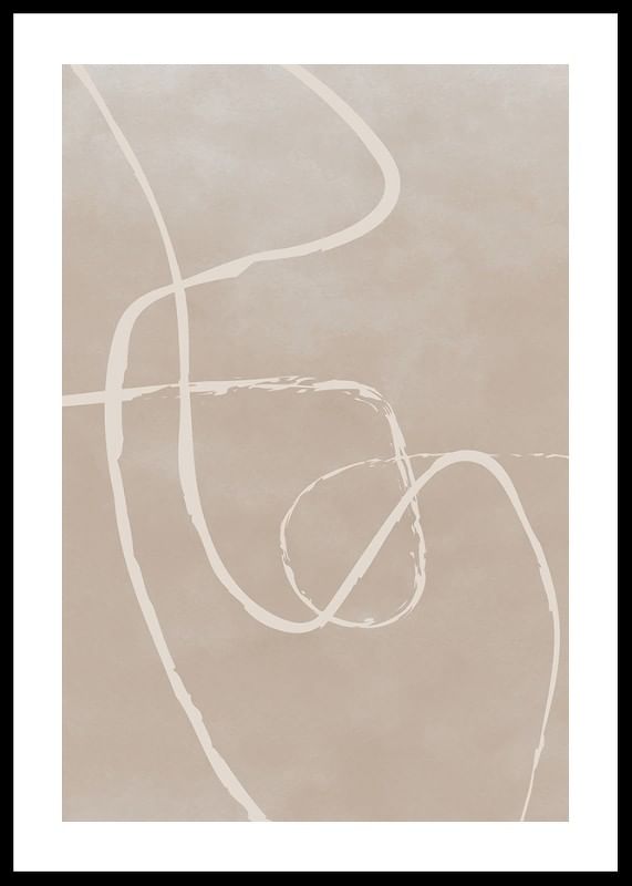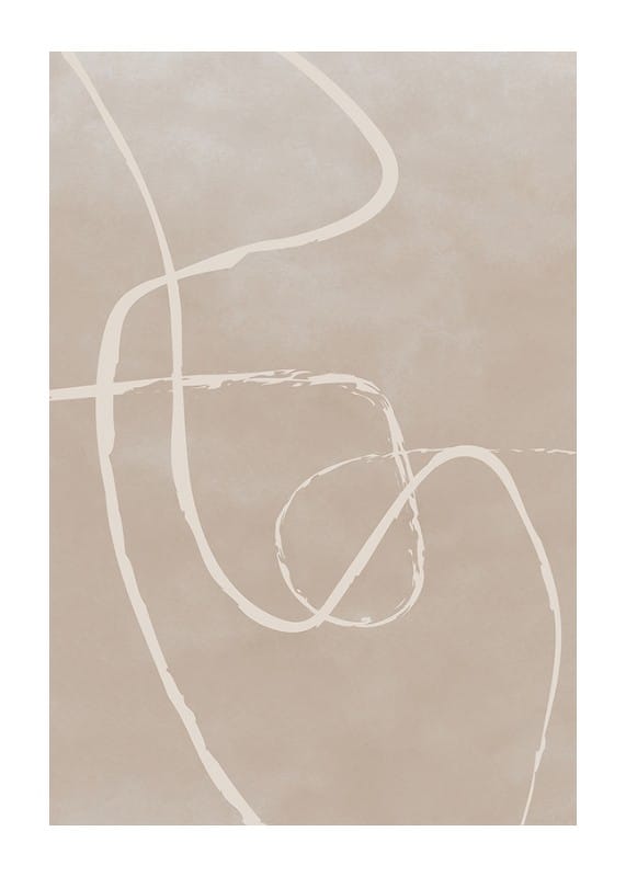 Líneas suaves y curvas en beige claro se mueven libremente sobre un fondo color arena con una textura suave. La composición minimalista crea una impresión etérea y moderna. Con su estilo sobrio, este póster es una adición discreta y elegante tanto para salas de estar como para entornos de trabajo.