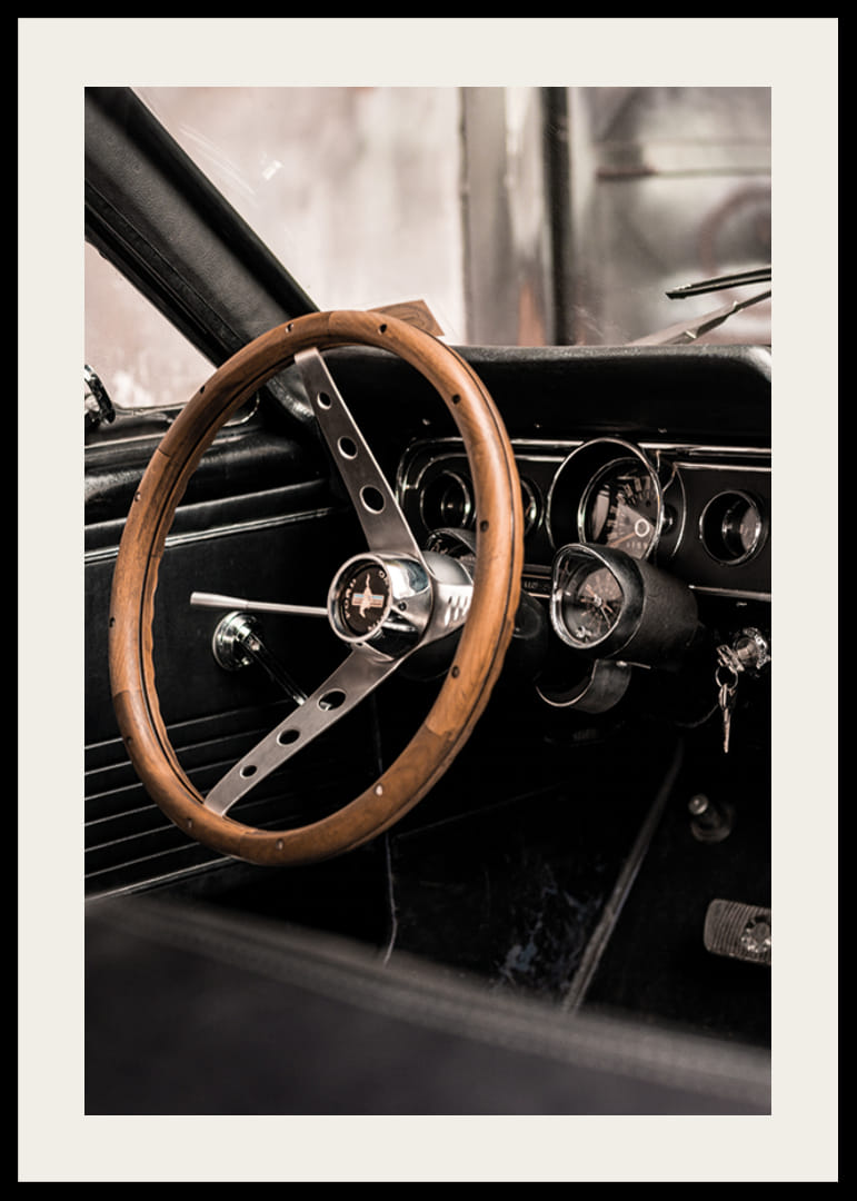 Primer plano del interior de un coche clásico, donde un volante de madera cobra protagonismo, rodeado de detalles cromados y salpicaderos negros. Los suaves tonos beige y negro le dan un aire atemporal. Este artículo encaja en el garaje, el estudio o la sala de estar, donde se realza el interés por la historia del motor y la época.
