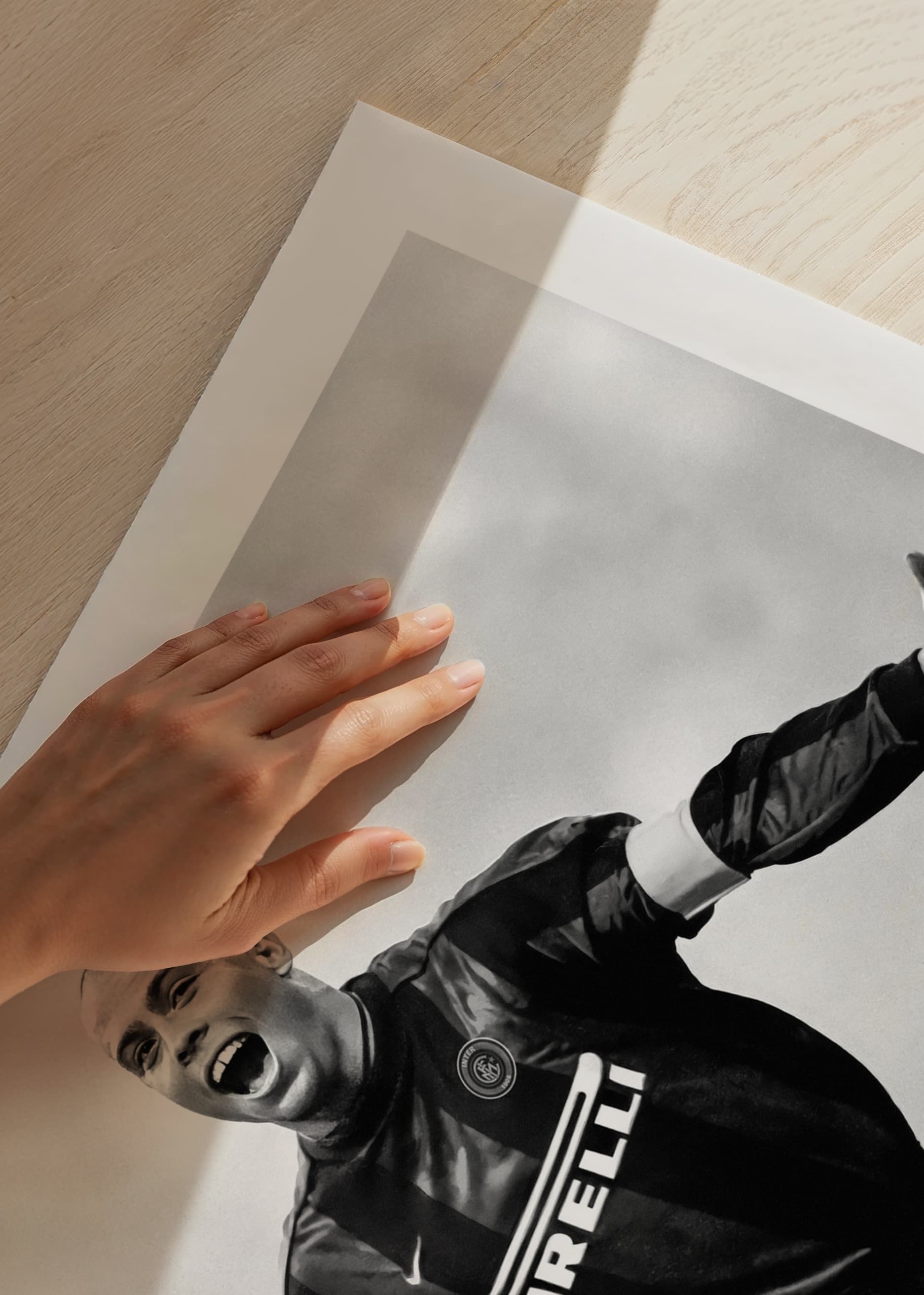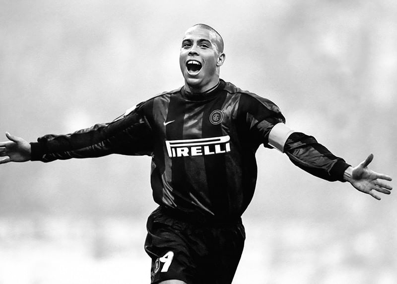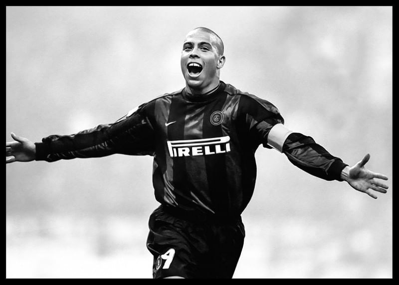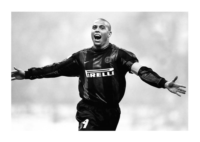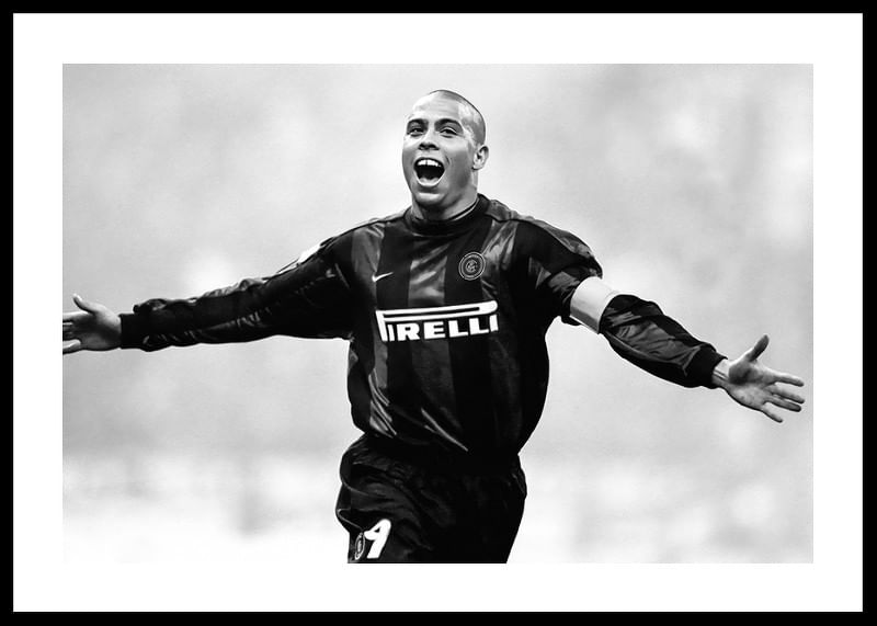 Póster en blanco y negro con una fotografía de la estrella del fútbol brasileño Ronaldo Luís Nazário de Lima en el Football Club Internazionale Milano en 1999.