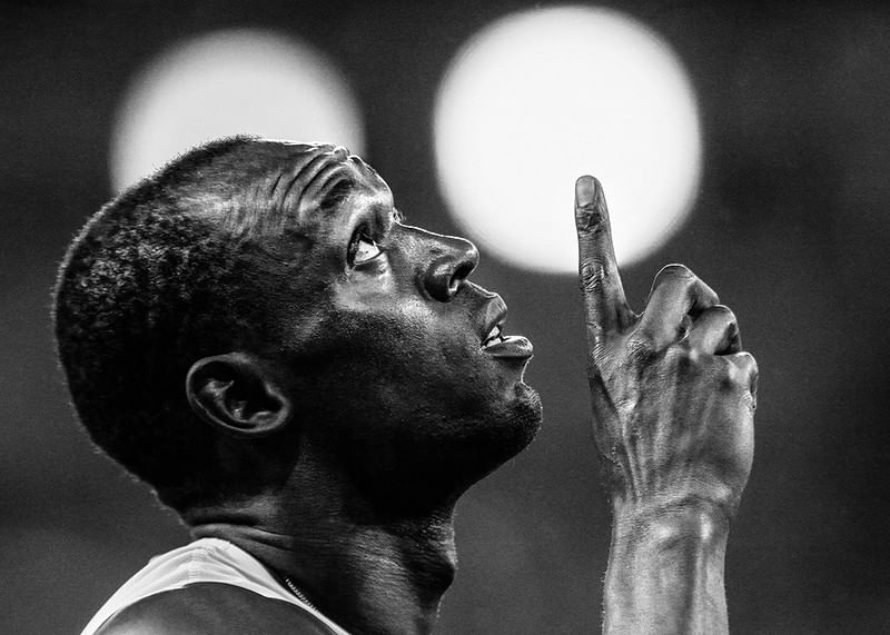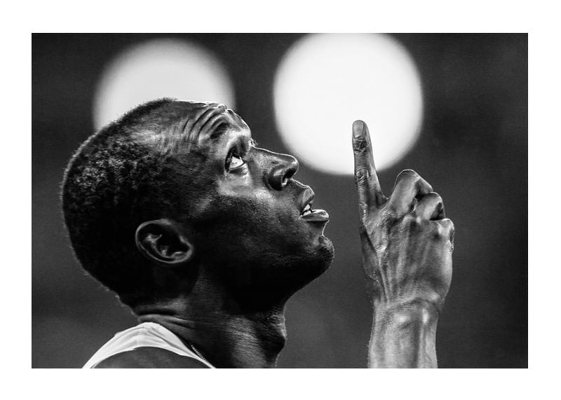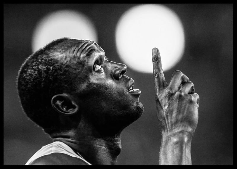 Póster en blanco y negro con una fotografía del jamaiquino Usain Bolt antes de la final de 200 metros en los Juegos Olímpicos de Río de Janeiro de 2016. Bolt ganó el sprint triple (100, 200 y 4x100) por tercera vez consecutiva.