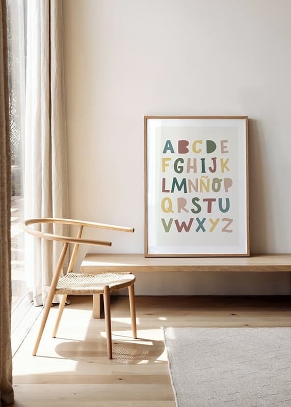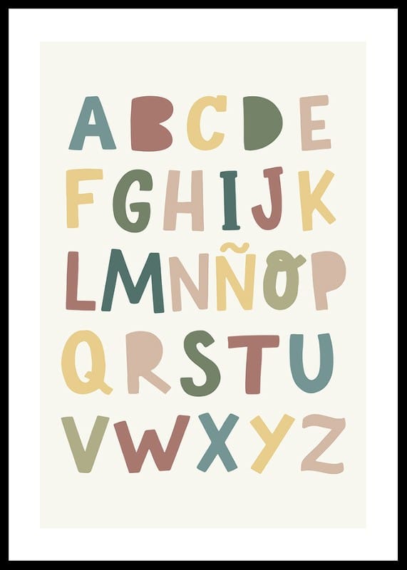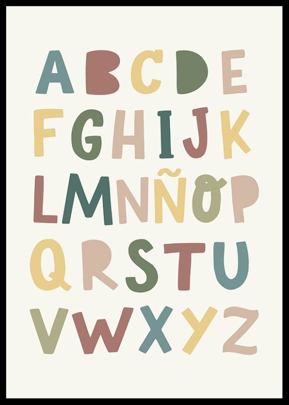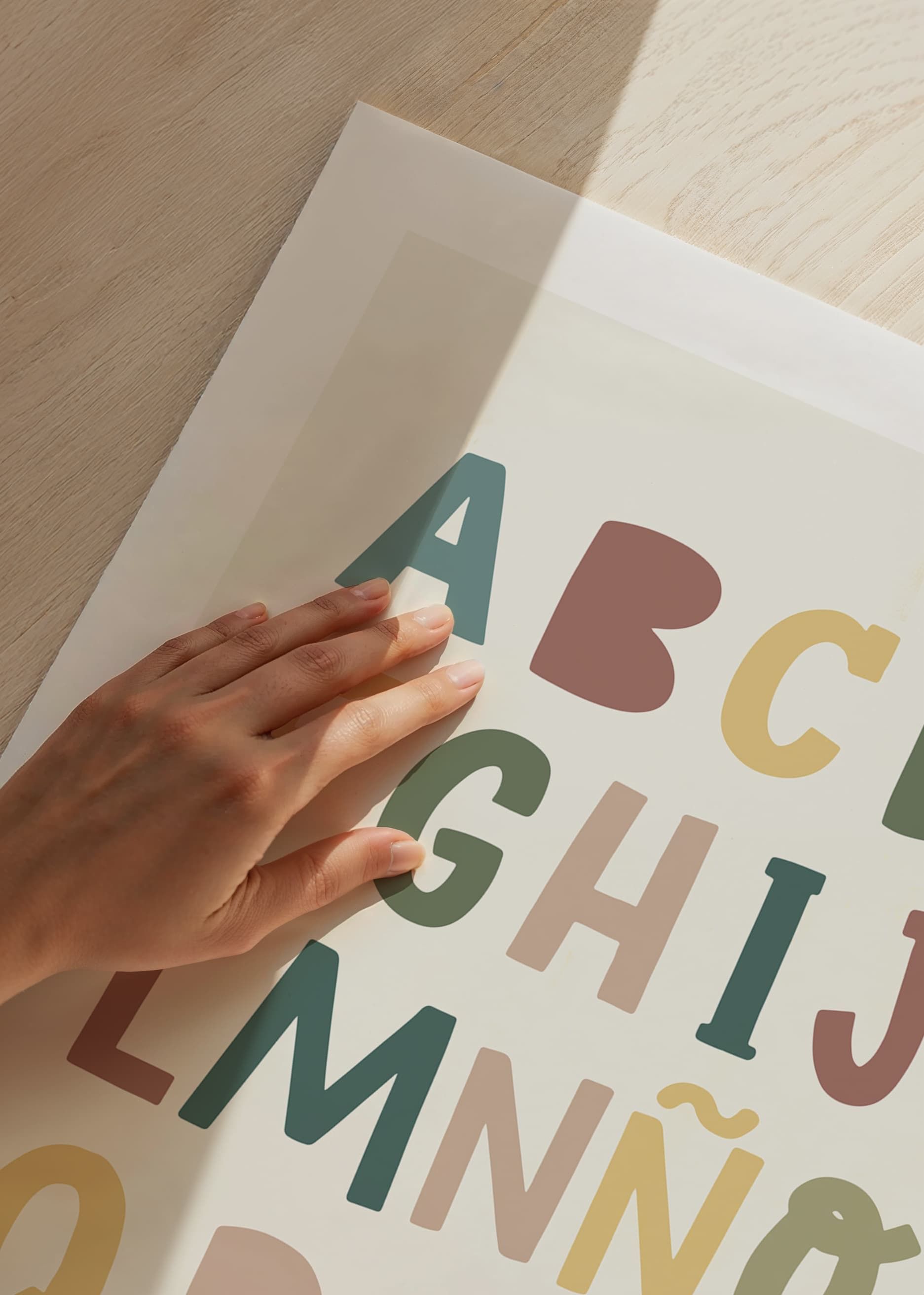 Transforma la habitación de los niños con este colorido y educativo cartel. El divertido diseño con el alfabeto en tonos suaves y apagados hace que el aprendizaje sea divertido y visualmente atractivo. Perfecto para inspirar la curiosidad y la creatividad de su hijo todos los días.