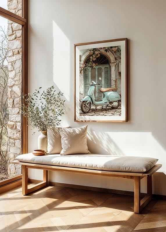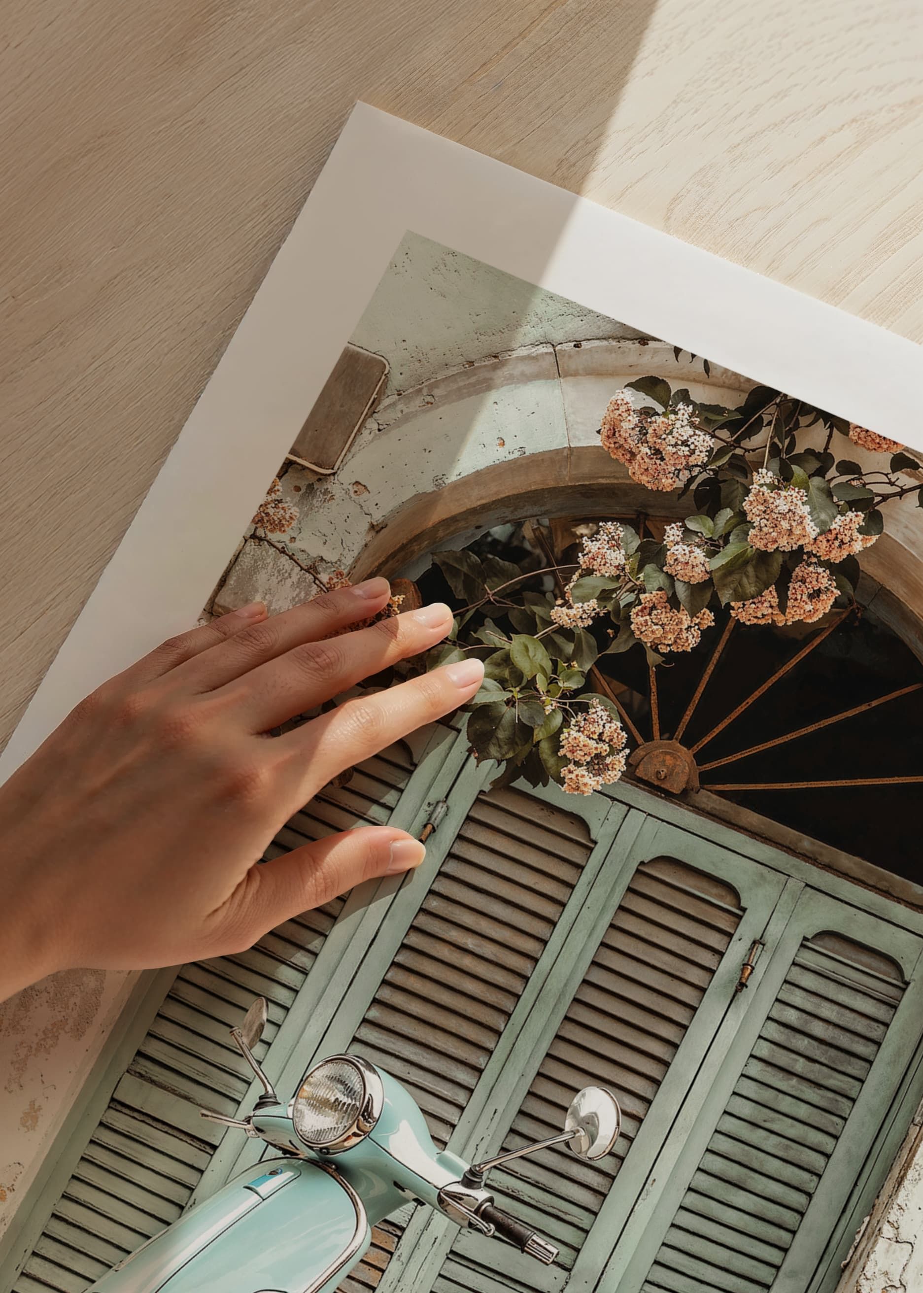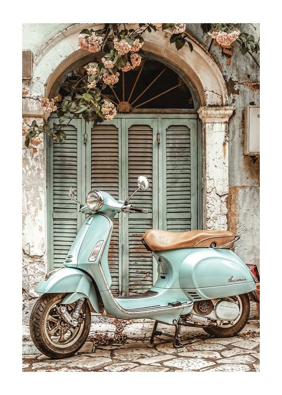 Capture la esencia del encanto italiano con nuestro encantador póster que representa una vespa verde menta frente a una puerta antigua y pintoresca con enredaderas florecientes. Esta escena nostálgica irradia una sensación de romance y aventura, perfecta para agregar un toque de belleza atemporal a su hogar u oficina. Con su paleta de colores suaves y su aire vintage, este póster es un complemento llamativo que evoca sueños de días soleados y calles sinuosas en un encantador pueblo italiano.
