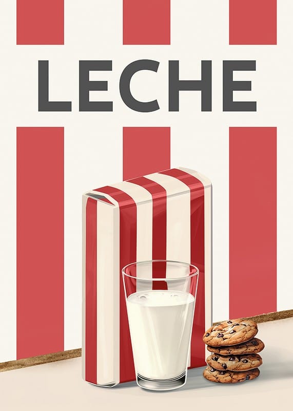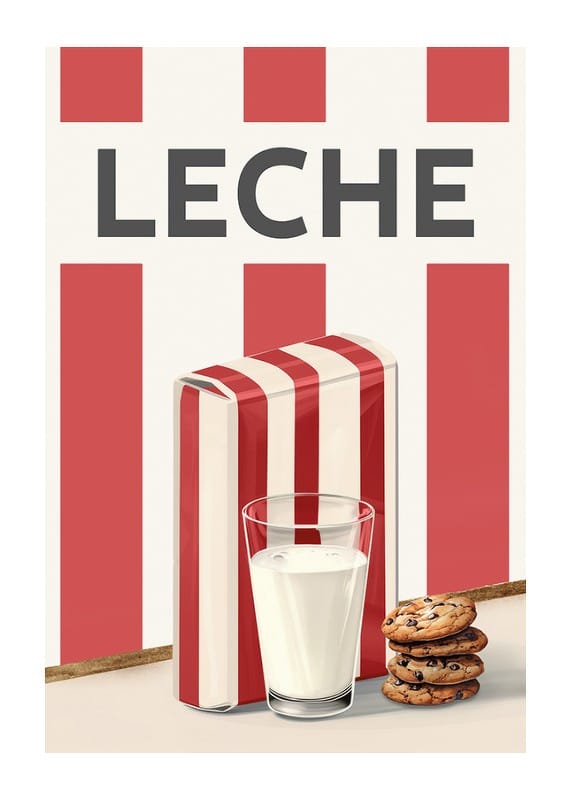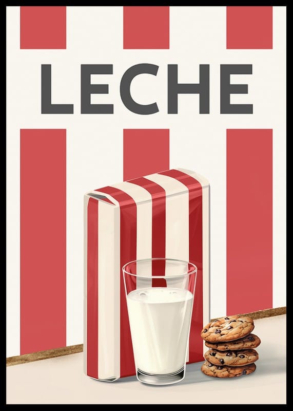 Experimente la simplicidad escandinava y el encanto retro con este elegante póster que presenta una pintura de leche en acuarela. Esta ilustración captura la atemporalidad de un vaso de leche fría, servido con galletas con chispas de chocolate, junto a un cartón de leche decorado con las clásicas rayas rojas y blancas. El diseño minimalista y la armoniosa paleta de colores hacen de este póster un detalle perfecto en la cocina o el comedor. Un homenaje a los placeres cotidianos, que transmite sensación de hogareño y buenos momentos.