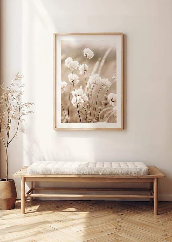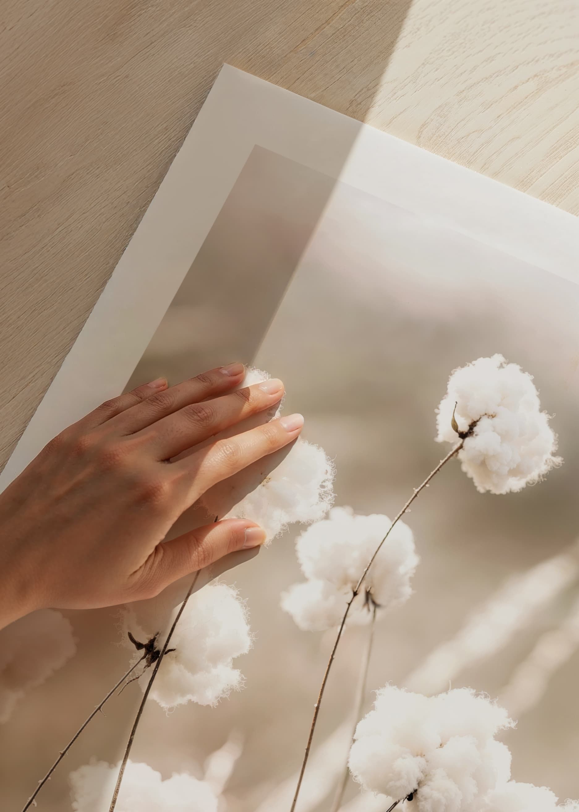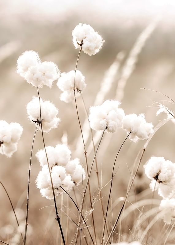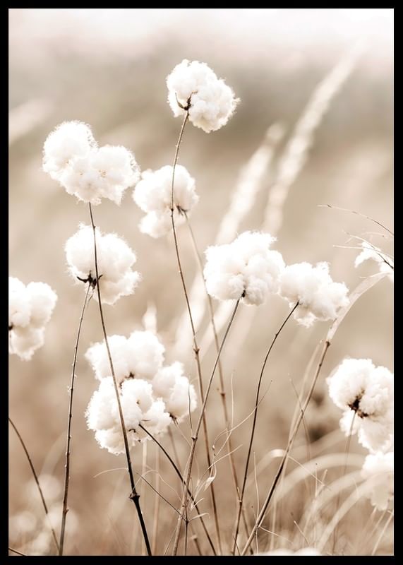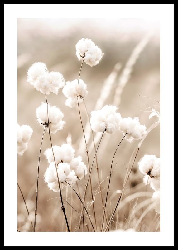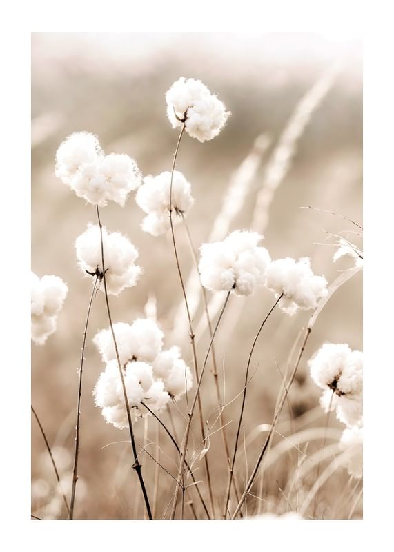 Este hermoso póster captura la tranquila belleza de la naturaleza con un motivo de suaves flores de algodón meciéndose con la brisa. Las bolas blancas y esponjosas contrastan con el fondo cálido y difuso, creando una sensación de quietud y tranquilidad. La sutil paleta de colores en tonos tierra contribuye a crear una atmósfera armoniosa que encaja perfectamente en cualquier habitación donde desee crear una sensación de calma y paz. Este cartel es ideal para darle a tu hogar un toque natural y sofisticado, recordando la belleza simple pero encantadora de la naturaleza.