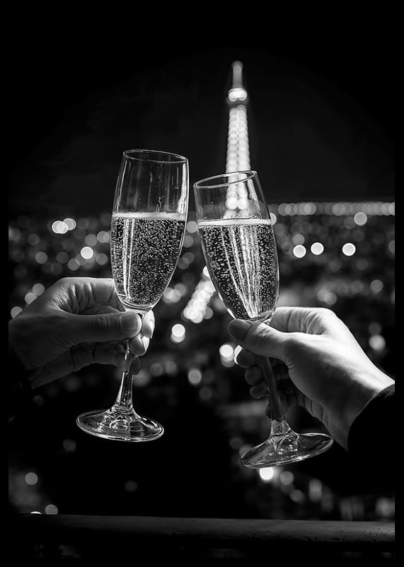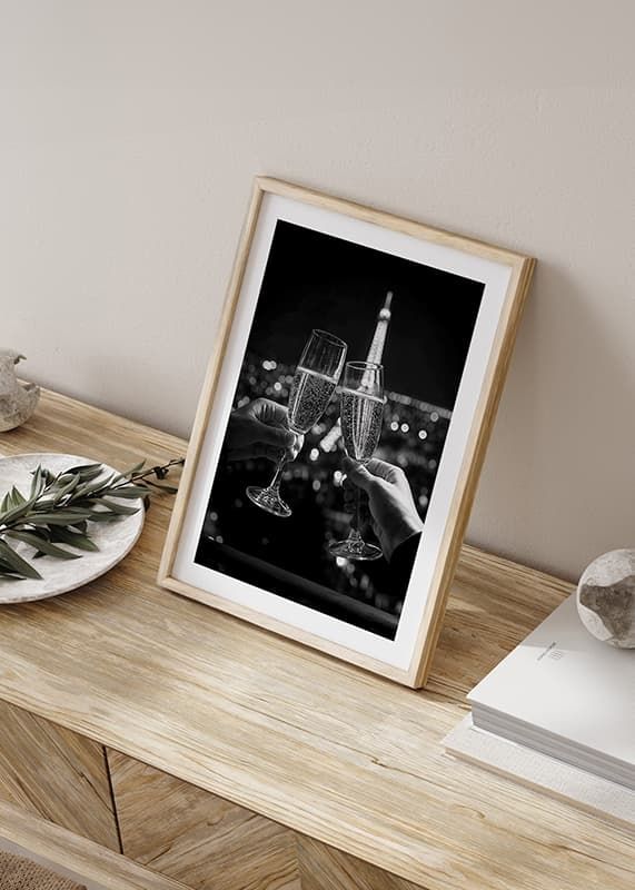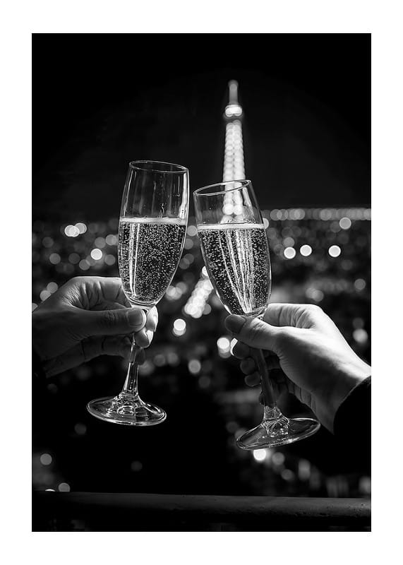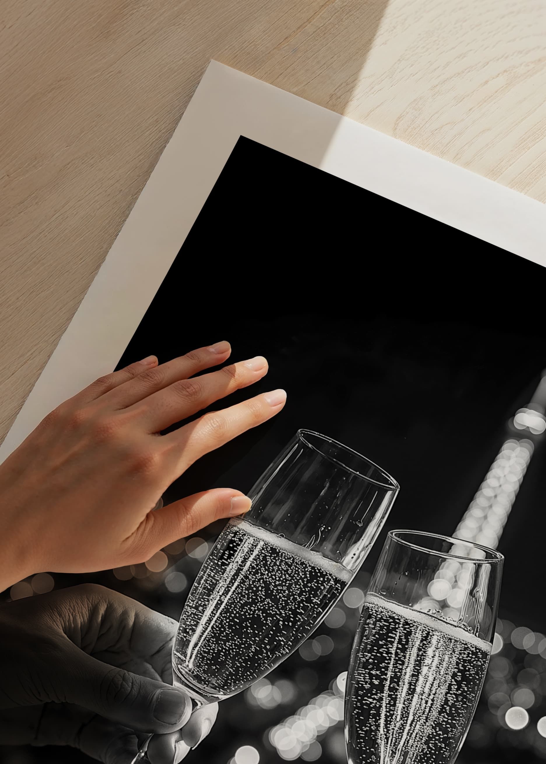 Celebre los momentos del amor y la vida con este elegante póster que captura dos copas de champán en un cuenco frente a la icónica Torre Eiffel, iluminada contra el horizonte nocturno de la ciudad. La imagen rezuma romanticismo, elegancia y exclusividad, perfecta para crear una atmósfera de magia y anticipación. El contraste blanco y negro resalta cada detalle y lo hace ideal para agregar un toque sofisticado a tu hogar u oficina.