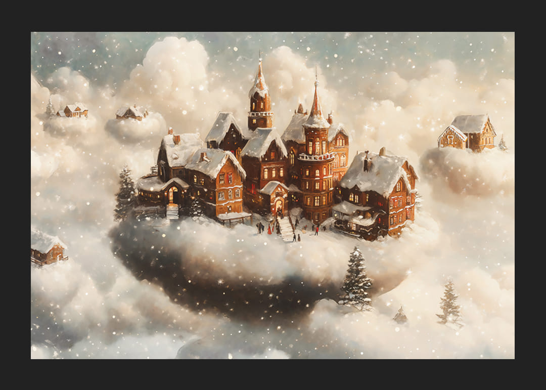 Transpórtate a un mundo mágico con este póster que representa un encantador pueblo invernal flotando entre las nubes. Con techos cubiertos de nieve y un brillo de ensueño, la imagen crea una sensación de maravilla y aventura navideña. Perfecto como decoración para difundir misterio y calidez en tu hogar o como regalo único. Deja que este cartel te invite a un invierno de cuento de hadas donde la fantasía se encuentra con la realidad.