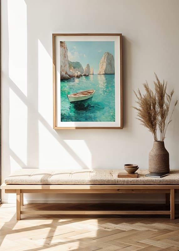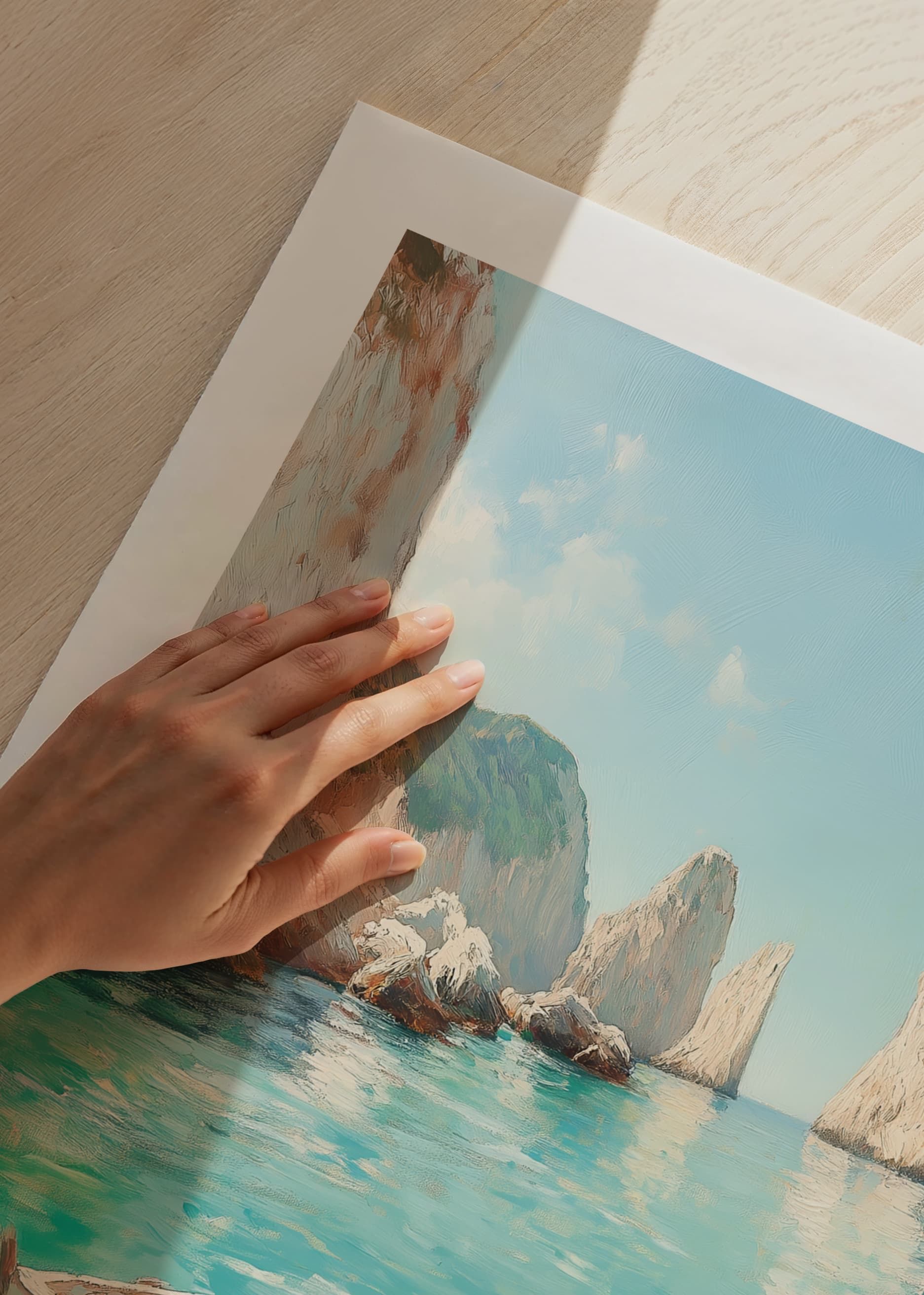 Este cartel captura la esencia de la tranquilidad y la libertad con un barco solitario descansando sobre aguas turquesas cristalinas, rodeado de majestuosas formaciones rocosas. Los rayos del sol bailan sobre la superficie del agua, creando una atmósfera armoniosa y relajante.