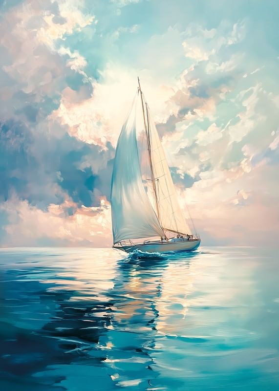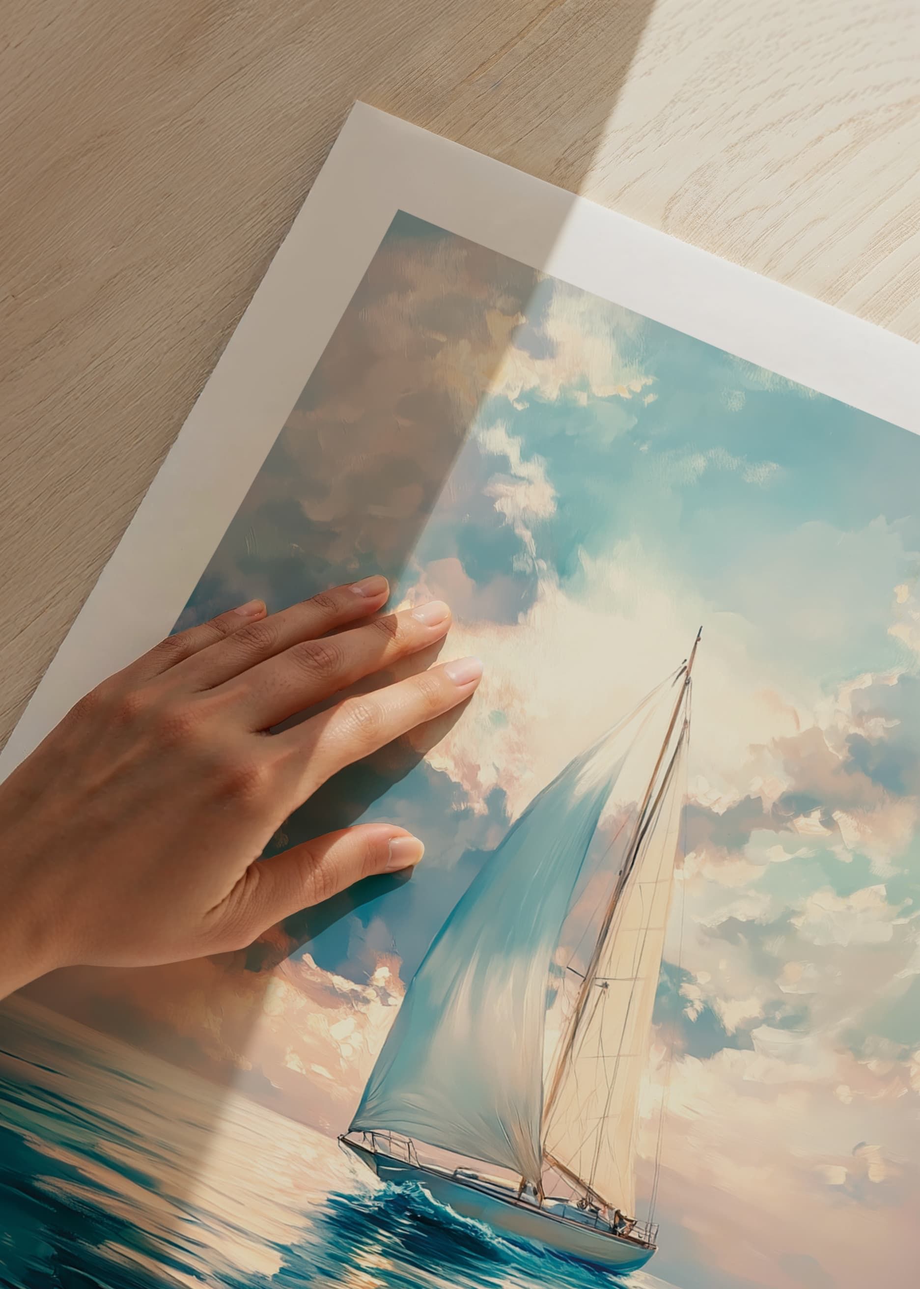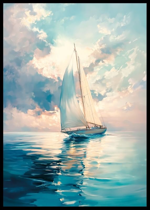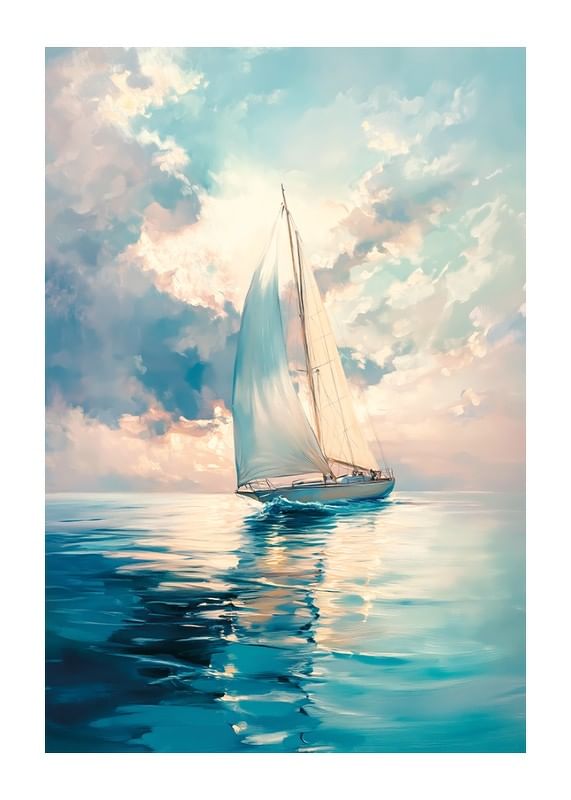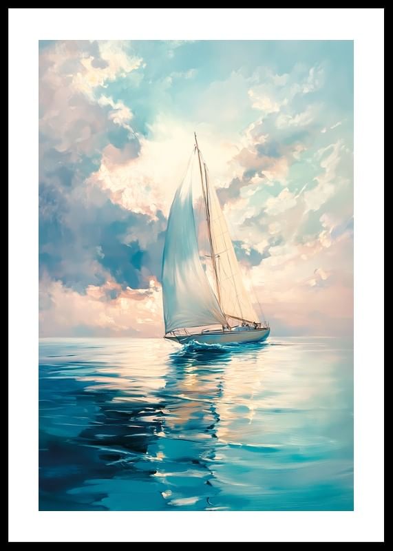 Un póster apacible y soñador que captura la sensación de libertad, calma y la poesía del mar. El motivo muestra un elegante velero deslizándose sobre un agua cristalina donde el cielo y el mar se funden en suaves tonos pastel. Los rayos del sol se reflejan en las olas y crean una atmósfera armoniosa que invita tanto a la reflexión como a la añoranza. Perfecto para quienes aman el mar, la tranquilidad y la belleza atemporal del paisaje abierto. Ideal para el salón, el dormitorio o la casa de verano. Parte de nuestra colección de pósteres de naturaleza y mar que aportan amplitud y paz a la habitación.