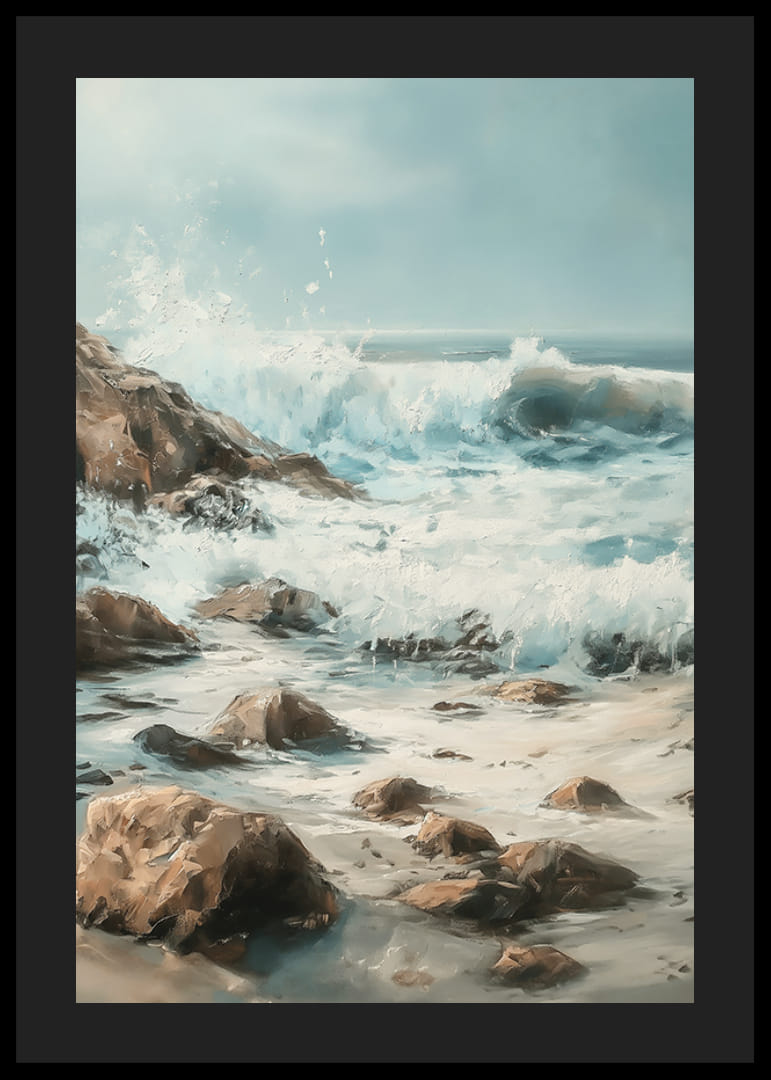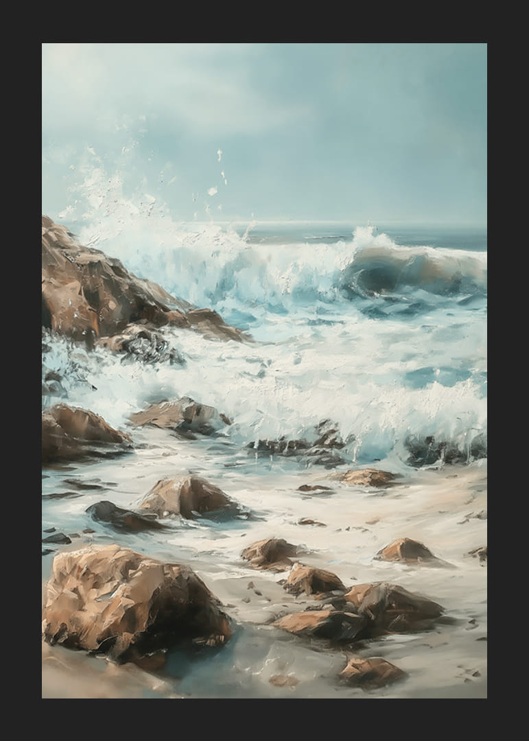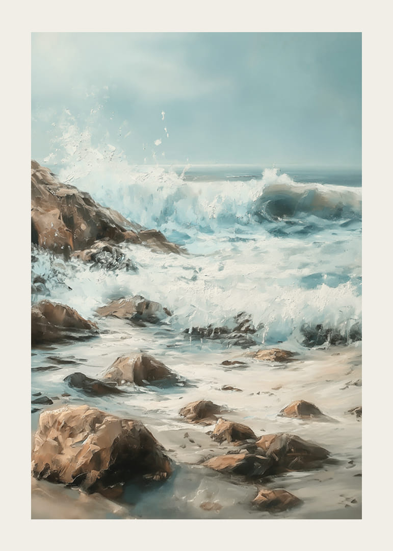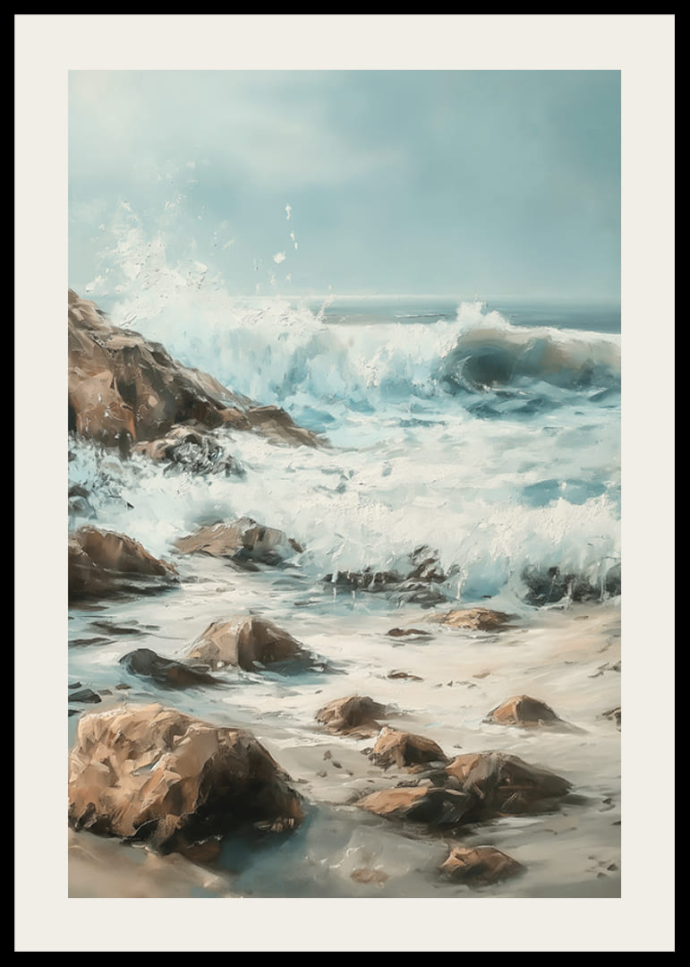 Captura el poder y la belleza del océano con este póster atmosférico de olas rompiendo contra una costa rocosa. Las pinceladas vibrantes y los armoniosos tonos azules y terrosos crean una sensación de dramatismo y calma.