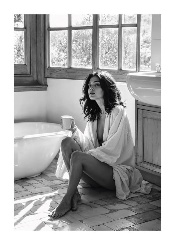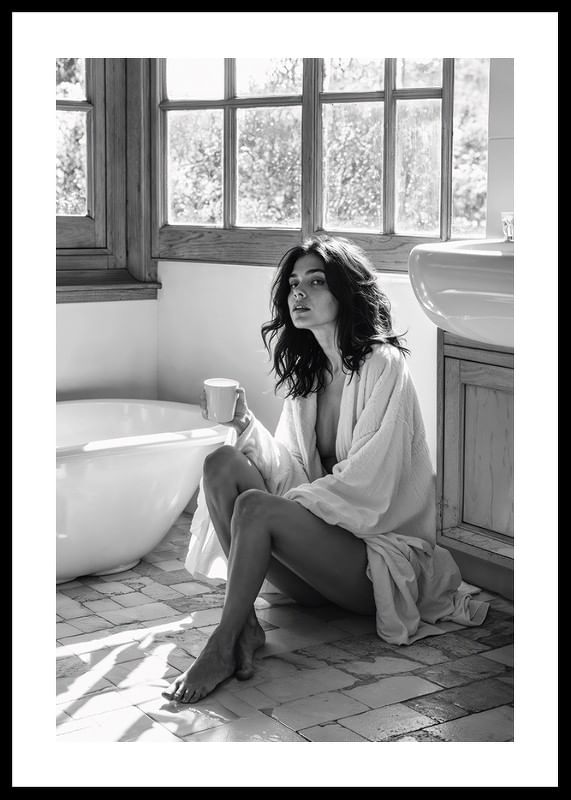 Ilumina tu hogar con este póster que captura la esencia de las mañanas tranquilas. Bajo una luz suave y natural, una mujer en albornoz se sienta en el suelo con una taza de café, rodeada de los armoniosos detalles del baño. Su aspecto relajado y la estética atemporal del entorno crean una sensación de calma y quietud. Perfecto para crear un ambiente cálido y sofisticado, donde cada detalle respira elegancia y pensamiento.