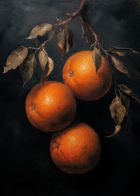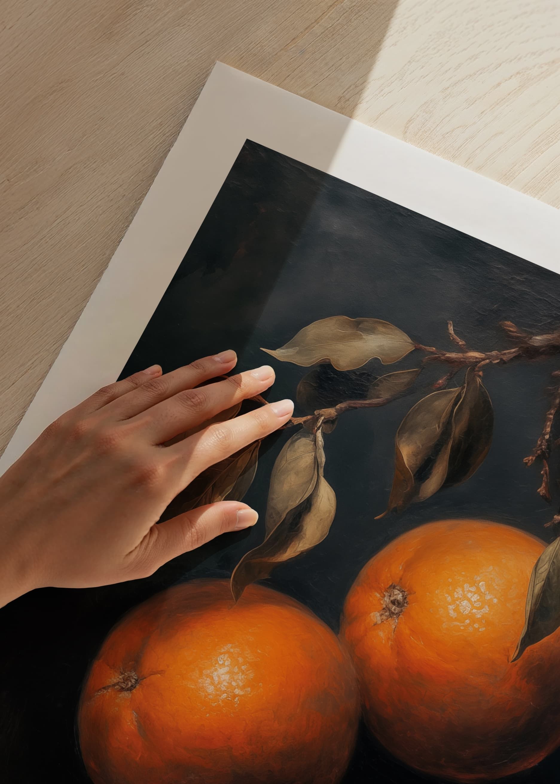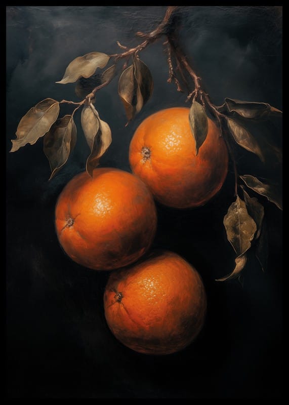 Este póster captura la belleza natural de las naranjas doradas que cuelgan de una rama sobre un fondo oscuro y elegante. Con su profundo contraste y ricos colores, la obra de arte irradia simplicidad sofisticada y encanto atemporal. Perfecto para la cocina, el comedor o la sala de estar, este póster crea una atmósfera cálida y acogedora que celebra los dones de la naturaleza.