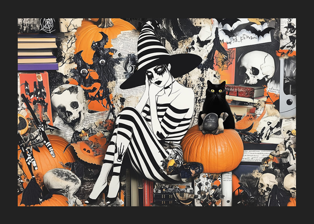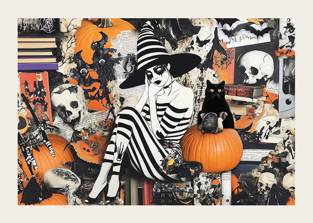 Este cartel transmite una sensación mágica y misteriosa con una bruja blanca y negra vestida de rayas, sentada entre calabazas y libros. Rodeado de murciélagos y calaveras, crea una atmósfera dramática que captura la esencia de Halloween.