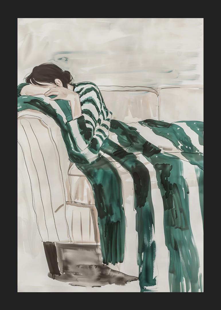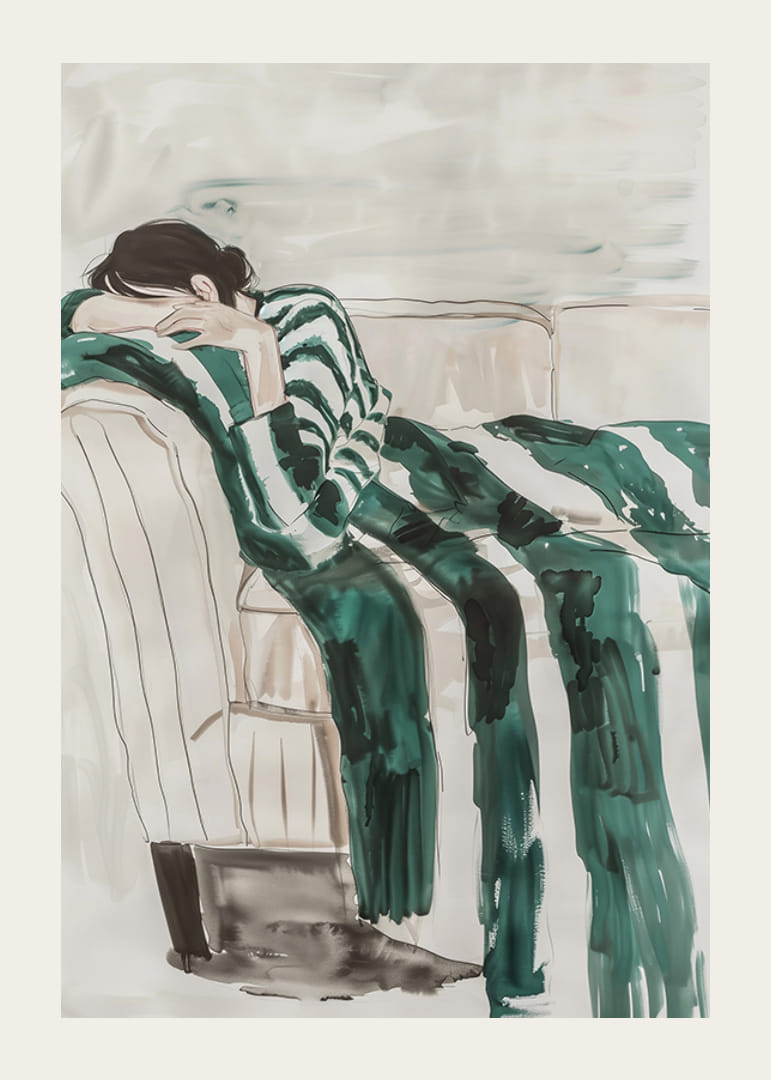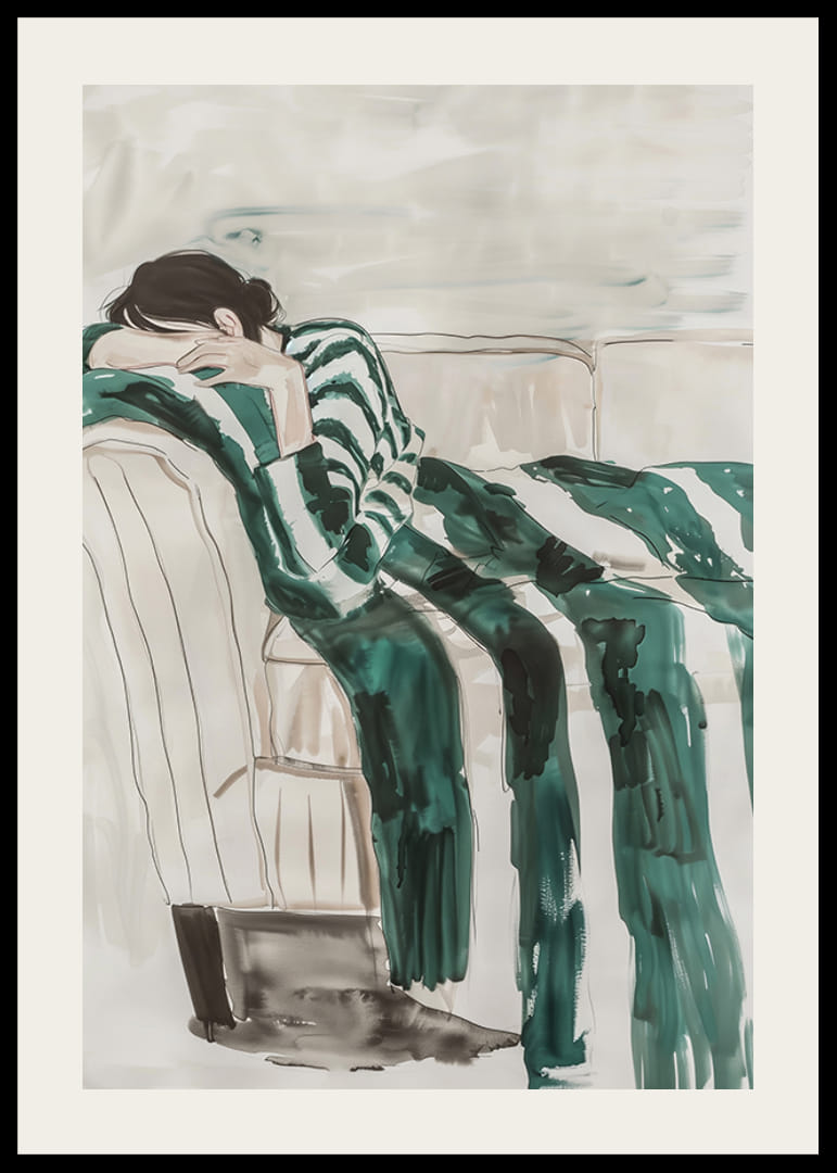 Esta ilustración artística captura una sensación de reflexión y descanso. Una persona se hunde en el sofá, vestida de rayas, con su cuerpo casi disuelto en las suaves pinceladas. Los tonos apagados y la expresión soñadora crean una sensación de quietud e introspección.