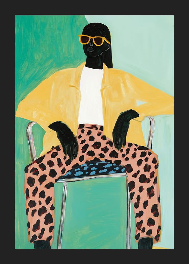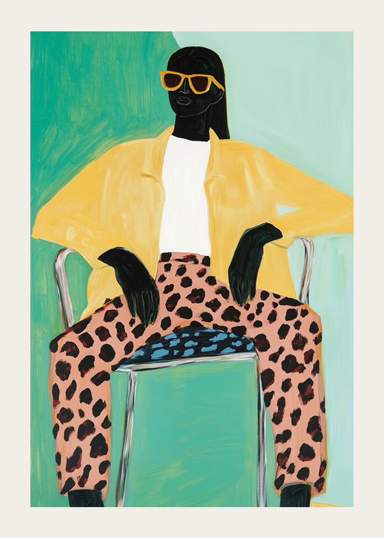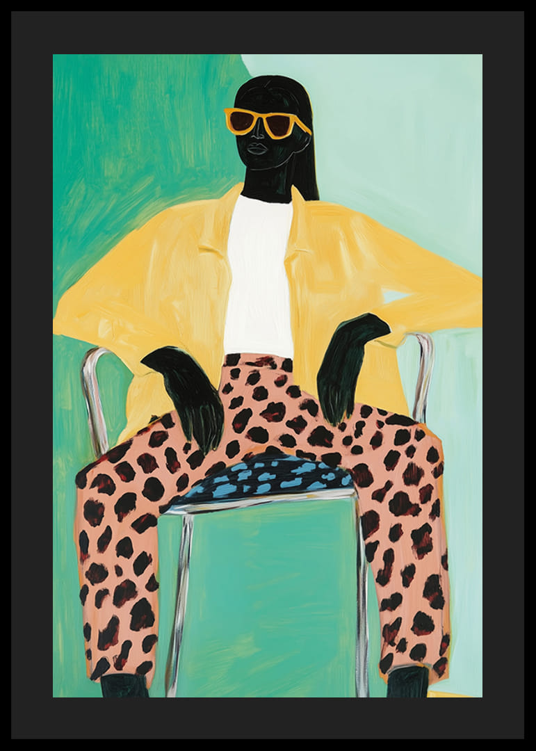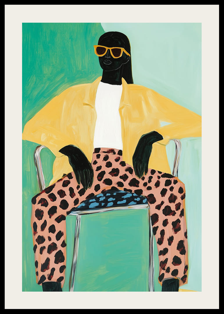¡Explora la esencia de la confianza con este llamativo póster! Con colores atrevidos y un estilo moderno, captura a un individuo elegante sentado en tranquila majestuosidad. Los pantalones con estampado de leopardo y la camisa amarilla sobre un fondo verde saturado crean un contraste dramático que da vida a la habitación.