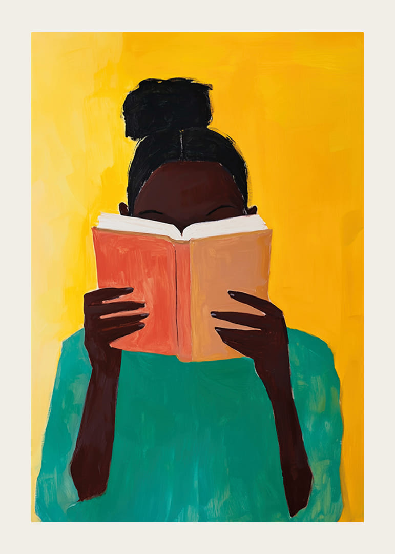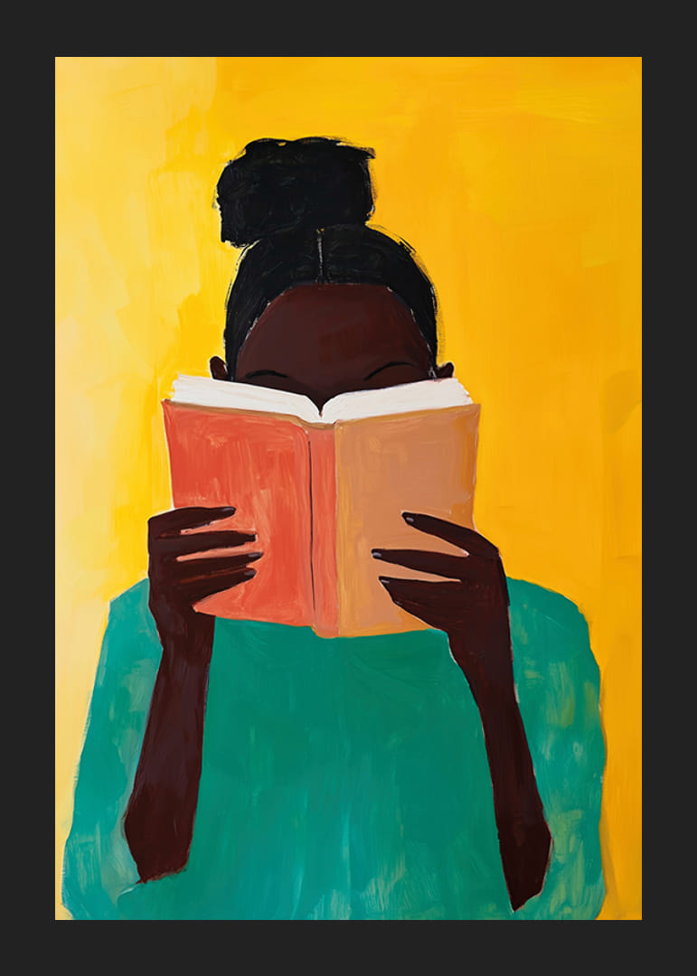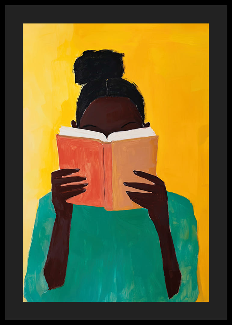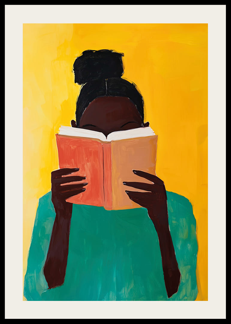 Sumérgete en un mundo de color e imaginación con este cautivador póster. Con un fondo que brilla en tonos dorados, el vívido retrato de una persona absorta en la lectura crea una sensación de calma y descubrimiento interior.