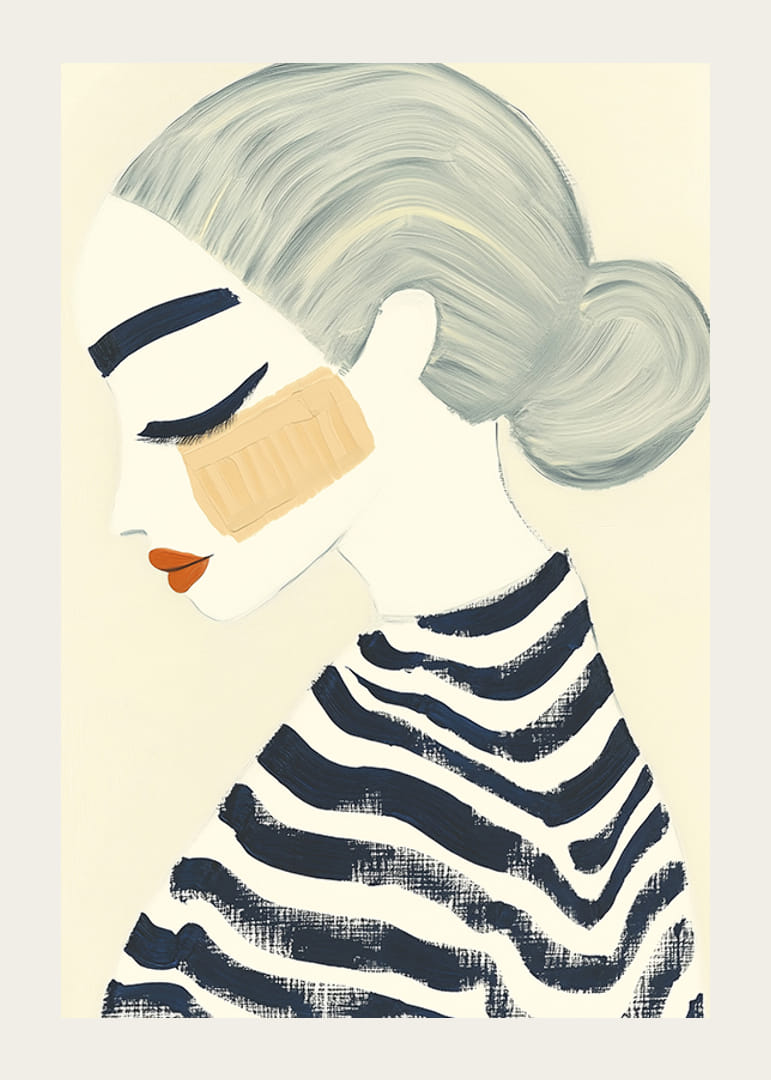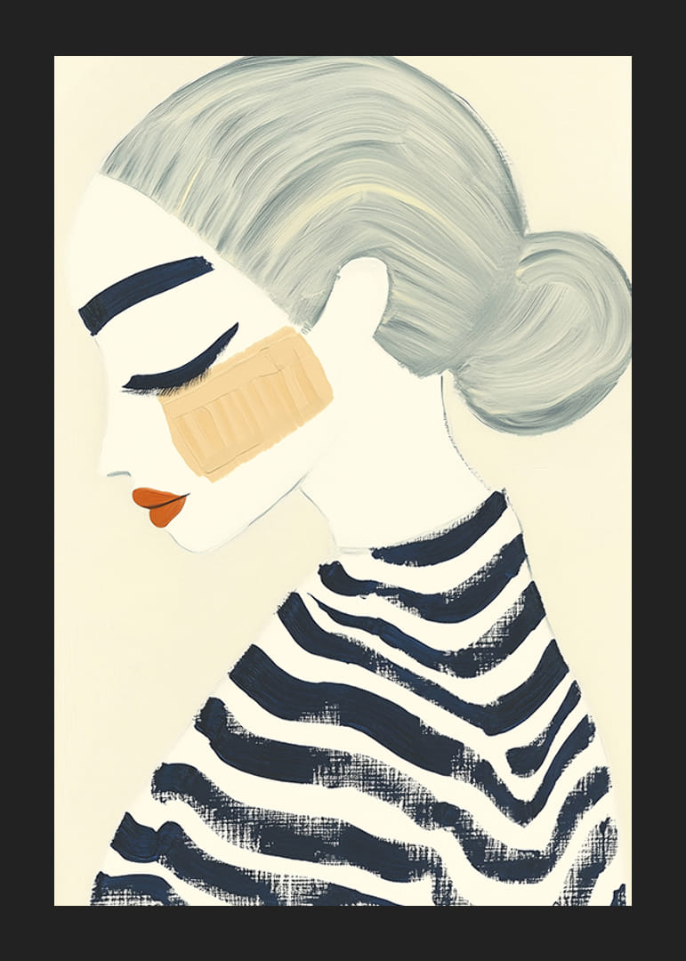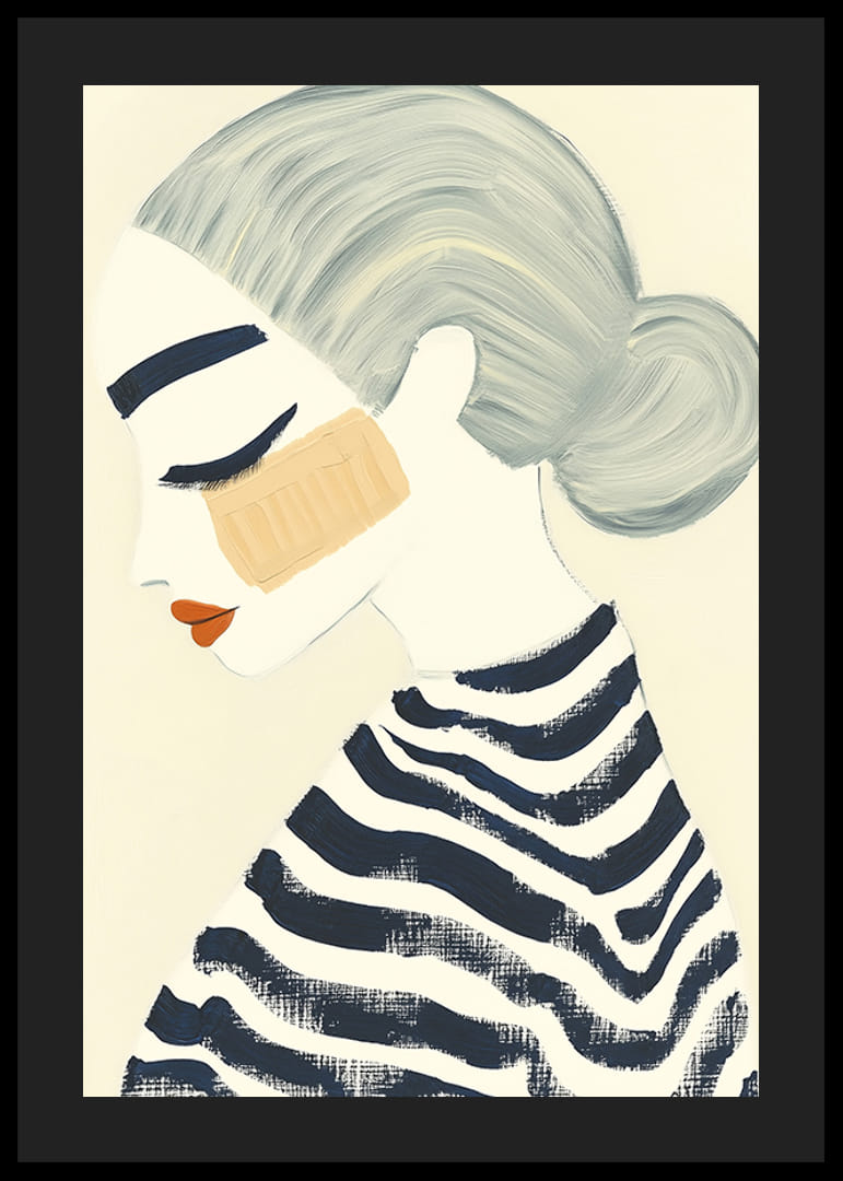 Captura el estilo y la elegancia con este expresivo póster de una mujer de perfil. Las suaves pinceladas moldean su silueta, mientras que las líneas atrevidas y gráficas del suéter de rayas crean un contraste armonioso.
