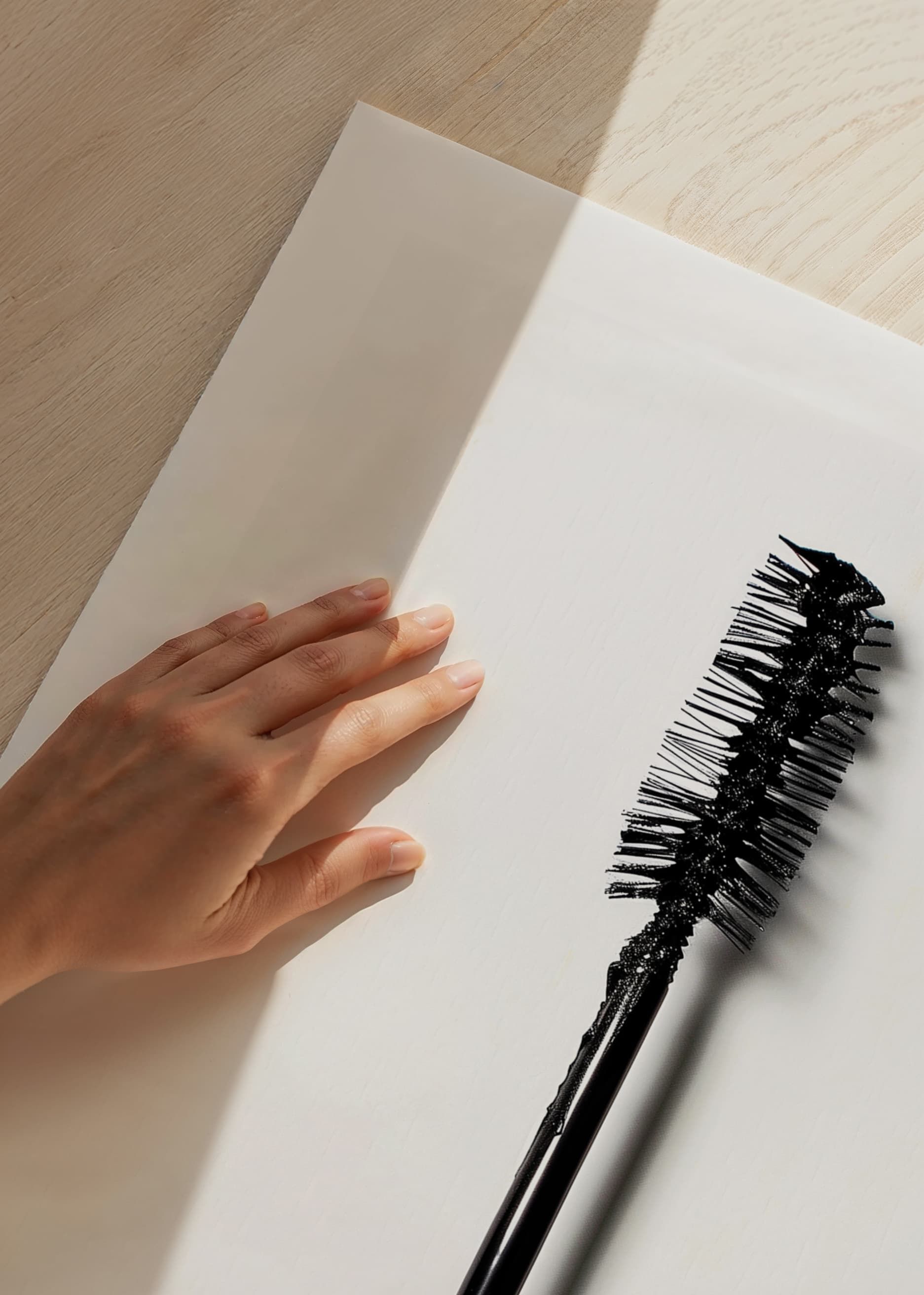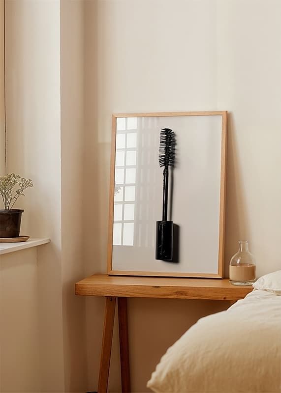 Este póster captura la elegante simplicidad de un cepillo de rímel negro sobre un fondo blanco puro. El color negro intenso simboliza tanto el dramatismo como la sutileza, dando una sensación de belleza sofisticada.