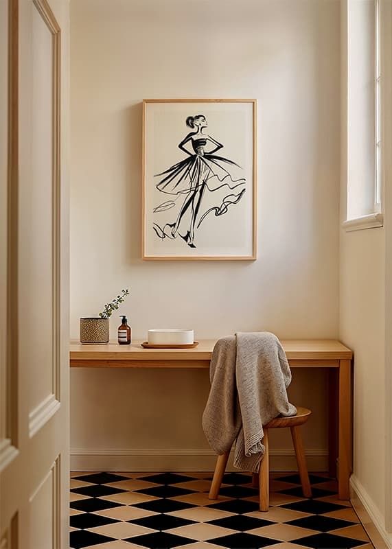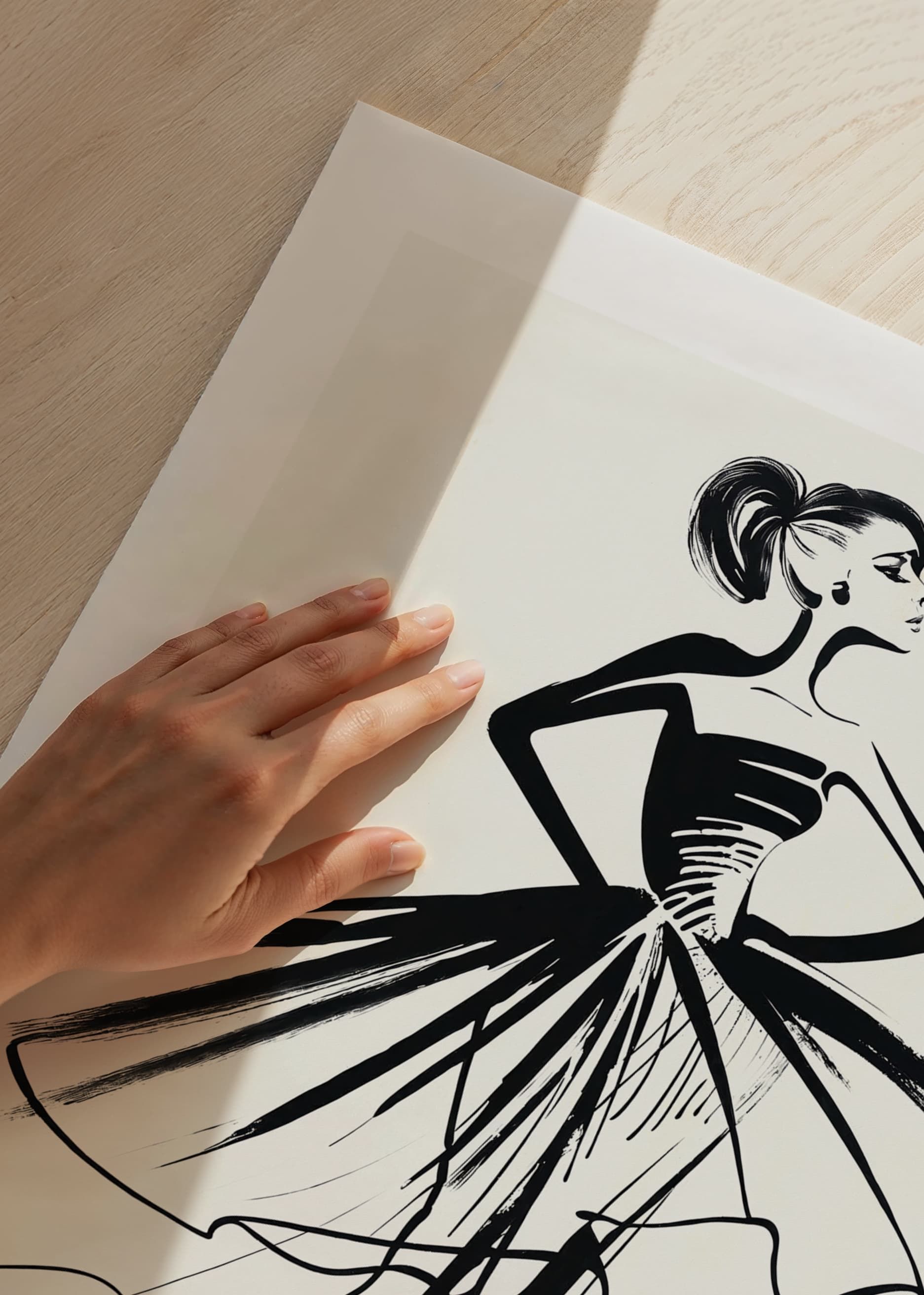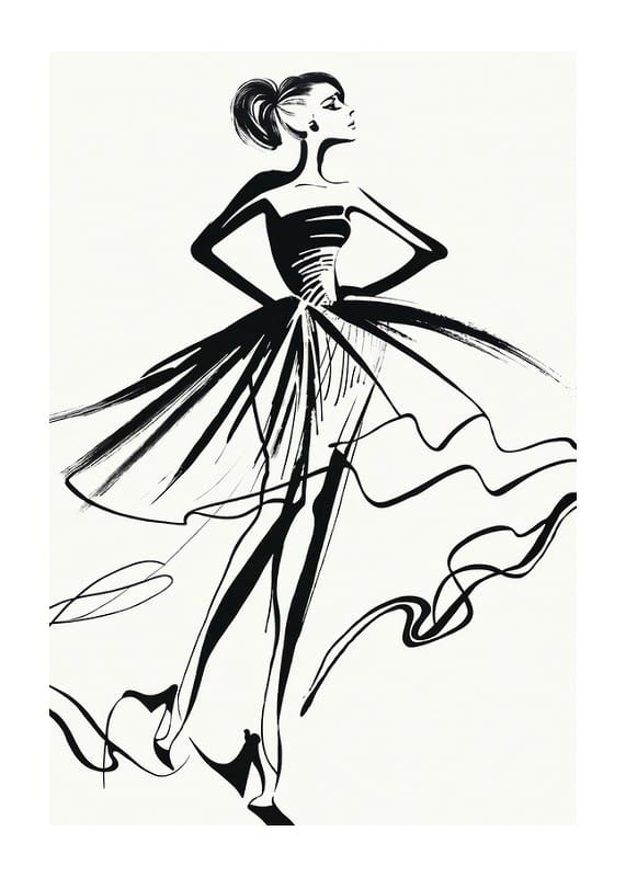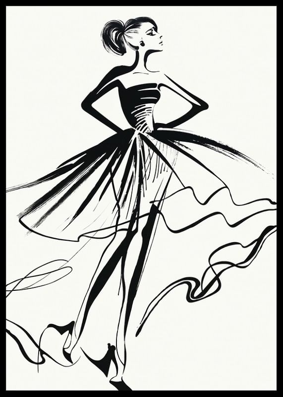 Captura la elegante belleza de este cartel que representa a una mujer elegante con un vestido fluido y artístico. Las líneas amplias y la silueta moderna crean una sensación de movimiento y encanto elegante.
