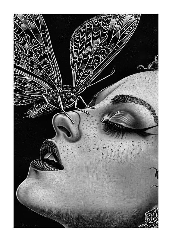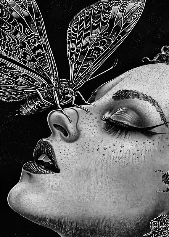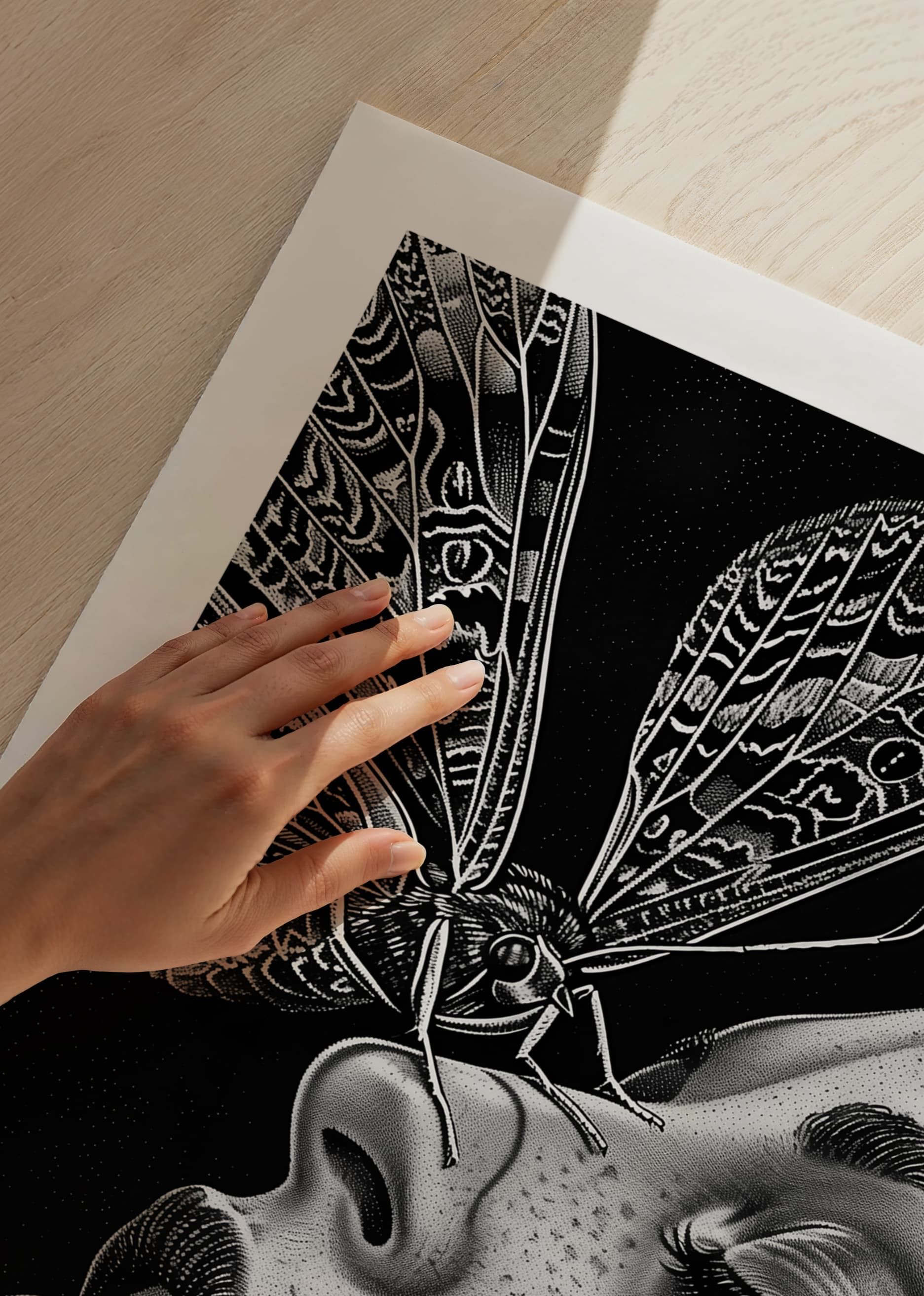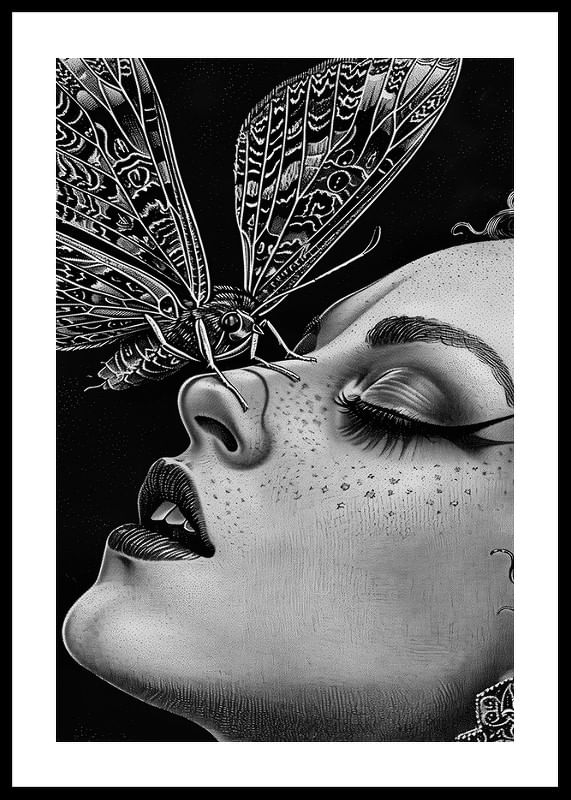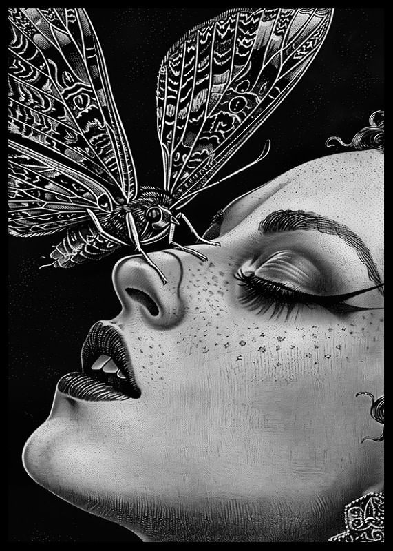 Este cartel transmite una sensación de misterio a través de su impresionante estructura en blanco y negro. Una polilla con alas intrincadas vuela cerca de un rostro, creando un encuentro entre el sueño y la realidad. Las líneas detalladas y el contraste crean una atmósfera mágica.