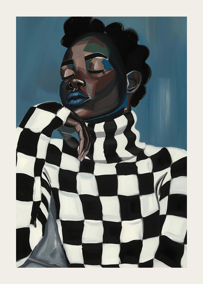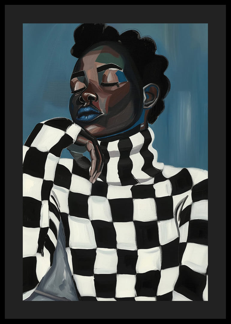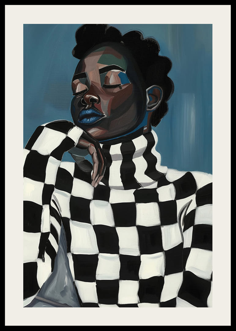 Descubra el cautivador mundo del arte moderno con este llamativo póster. El motivo, una persona elegante vestida con un suéter blanco y negro profundamente gráfico, exuda una sensación de contemplación y fortaleza. El fondo azul realza la expresión audaz del motivo y le da a su habitación una sensación de calma y energía.